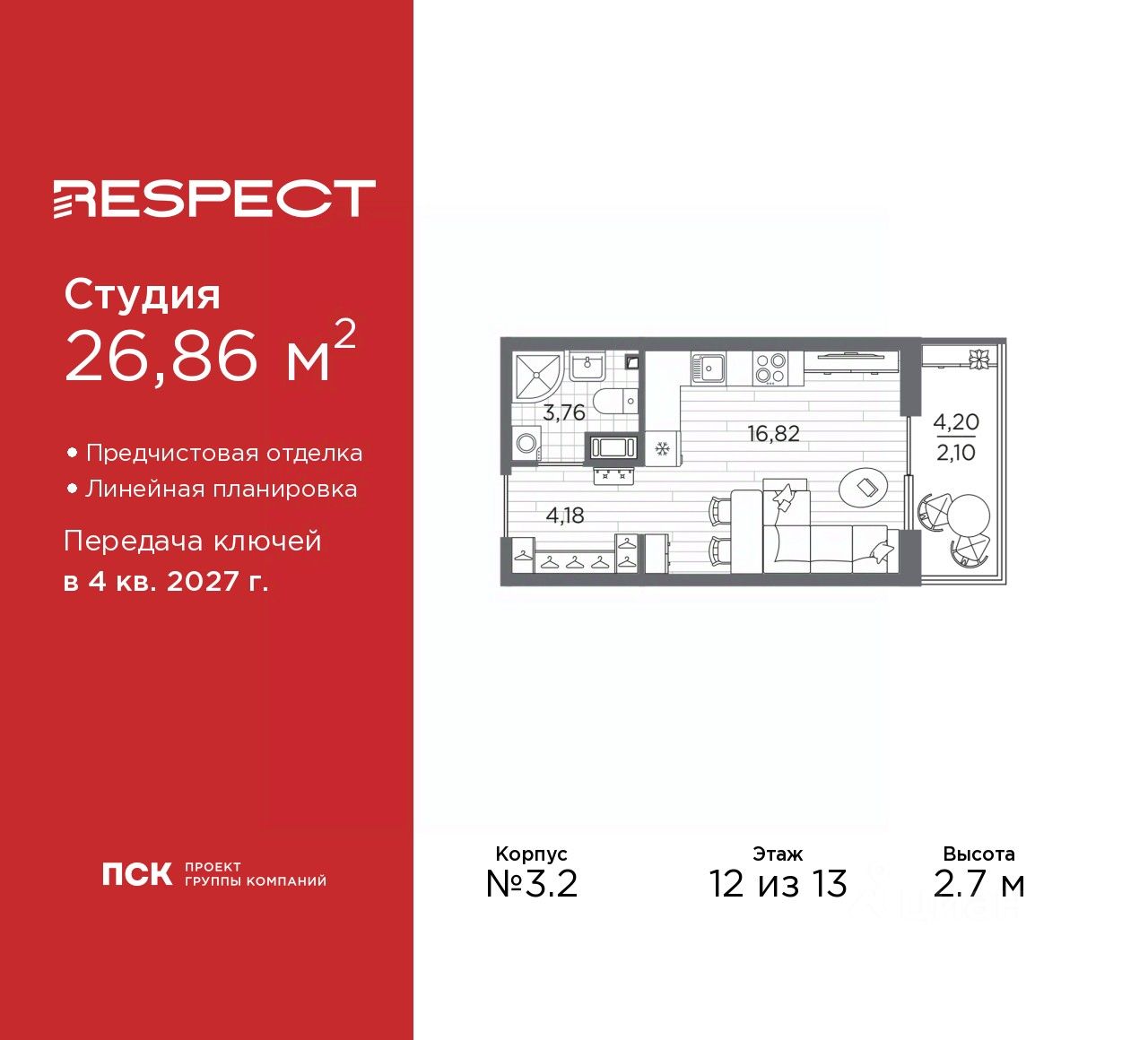 Продается 1-комн. квартира-студия от застройщика с отделкой в ЖК ''RESPECT'' на 11 этаже. Общая площадь: 26.59 кв.м., площадь гостиной 16.82 кв.м., из которых 5 кв.м. выделено под кухонную зону. Все окна выходят на одну сторону. В квартире один балкон, один совмещенный санузел. Высота потолков 2.7 м. Дом монолитный, многоподъездный, переменной этажности, от 8 до 13 этажей. Квартира находится в 1-й секции высотой 13 этажей в корпусе 3.3. На этаже 6 квартир. В подъезде 1 пассажирский и 1 грузовой лифт. Начало строительства - 3 квартал 2025 года. Окончание строительства - 4 квартал 2027 года. Оформление сделки по договору долевого участия. В шаговой доступности от жилого комплекса находятся станции метро (расстояние по прямой): ''Лесная'' (800 м), ''Площадь Мужества'' (1.4 км), ''Выборгская'' (1.9 км), также недалеко от этого корпуса расположены станции метро: ''Академическая'', ''Политехническая''. Жилой квартал ''RESPECT'' строится на Полюстровском пр, 87, в одной из самых востребованных локаций Петербурга. В 10 минутах пешком - метро ''Лесная'' и в 10 минутах на транспорте - Петроградская сторона. Высота домов от 7 до 13 этажей. Квартиры сдаются с отделкой white box и с чистовой отделкой. На территории Respect строится школа на 1125 учащихся и детский сад на 240 мест. Запроектированы собственная газовая котельная, закрытая территория, дворы без машин и подземные паркинги с лифтами.В проекте предусмотрены трапециевидные балконы или остекленные лоджии, которые, с одной стороны, исключают монотонность фасада, являясь декоративными элементами, с другой дополнительным функциональным пространством в квартирах. Цветовая гармония фасадов каждого дома раскрывает характер квартала. Коричневый цвет клинкерного кирпича со структурой водяных штрихов — цвет уюта и безопасности, сдержанности и надёжности. Вентилируемые фасады облицованы клинкерным кирпичом. Его высокая прочность позволяет давать 100 лет гарантии на этот материал. Водопоглощение клинкерного кирпича составляет менее 5%, за счет чего у него высокая теплопроводность и прочность. В квартале запроектированы внутренние закрытые территории дворов домов без доступа автомобилей и безбарьерная среда для велосипедистов и колясок. Предусмотрены IP-домофония с функцией дистанционного открывания калиток и парадных, а также дистанционный сбор показаний счетчиков и мобильное приложение для жителей. Для безопасности жителей квартала - круглосуточное видеонаблюдение и служба охраны. В каждой квартире предусмотрены внешние корзины для кондиционеров. Вся территория квартала будет связана единой концепцией благоустройства, разработанной ландшафтным бюро L.BURO. На эксплуатируемой кровле на уровне первого этажа в домах 1 и 4 будут обустроены общественные видовые террасы. Это станет не только привлекательным местом с красивым видом, но и удобным, многофункциональным пространством. Дизайн парадных зон и входных групп - сочетание лаконичности отделки и декоративных элементов с текстурами из натурального камня и