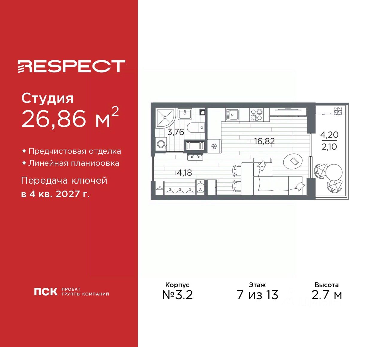Просторная 1-комн. квартира-студия с отделкой в ЖК ''RESPECT'' на 11 этаже. Общая площадь: 27.67 кв.м., площадь гостиной 17.98 кв.м., из которых 5 кв.м. выделено под кухонную зону. Все окна выходят на одну сторону. В квартире один балкон, один совмещенный санузел. Высота потолков 2.7 м. Дом монолитный, многоподъездный, переменной этажности, от 8 до 13 этажей. Квартира находится в 1-й секции высотой 13 этажей в корпусе 3.3. На этаже 6 квартир. В подъезде 1 пассажирский и 1 грузовой лифт. Начало строительства - 3 квартал 2025 года. Окончание строительства - 4 квартал 2027 года. Оформление сделки по договору долевого участия. В шаговой доступности от жилого комплекса находятся станции метро (расстояние по прямой): ''Лесная'' (800 м), ''Площадь Мужества'' (1.4 км), ''Выборгская'' (1.9 км), также недалеко от этого корпуса находятся станции метро: ''Академическая'', ''Политехническая''. Жилой квартал ''RESPECT'' строится на Полюстровском пр, 87, в одной из самых востребованных локаций Петербурга. В 10 минутах пешком - метро ''Лесная'' и в 10 минутах на транспорте - Петроградская сторона. Высота домов от 7 до 13 этажей. Квартиры сдаются с отделкой white box и с чистовой отделкой. На территории Respect строится школа на 1125 учащихся и детский сад на 240 мест. Запроектированы собственная газовая котельная, закрытая территория, дворы без машин и подземные паркинги с лифтами.В проекте предусмотрены трапециевидные балконы или остекленные лоджии, которые, с одной стороны, исключают монотонность фасада, являясь декоративными элементами, с другой дополнительным функциональным пространством в квартирах. Цветовая гармония фасадов каждого дома раскрывает характер квартала. Коричневый цвет клинкерного кирпича со структурой водяных штрихов — цвет уюта и безопасности, сдержанности и надёжности. Вентилируемые фасады облицованы клинкерным кирпичом. Его высокая прочность позволяет давать 100 лет гарантии на этот материал. Водопоглощение клинкерного кирпича составляет менее 5%, за счет чего у него высокая теплопроводность и прочность. В квартале запроектированы внутренние закрытые территории дворов домов без доступа автомобилей и безбарьерная среда для велосипедистов и колясок. Предусмотрены IP-домофония с функцией дистанционного открывания калиток и парадных, а также дистанционный сбор показаний счетчиков и мобильное приложение для жителей. Для безопасности жителей квартала - круглосуточное видеонаблюдение и служба охраны. В каждой квартире предусмотрены внешние корзины для кондиционеров. Вся территория квартала будет связана единой концепцией благоустройства, разработанной ландшафтным бюро L.BURO. На эксплуатируемой кровле на уровне первого этажа в домах 1 и 4 будут обустроены общественные видовые террасы. Это станет не только привлекательным местом с красивым видом, но и удобным, многофункциональным пространством. Дизайн парадных зон и входных групп - сочетание лаконичности отделки и декоративных элементов с текстурами из натурального камня и дерева с приглу