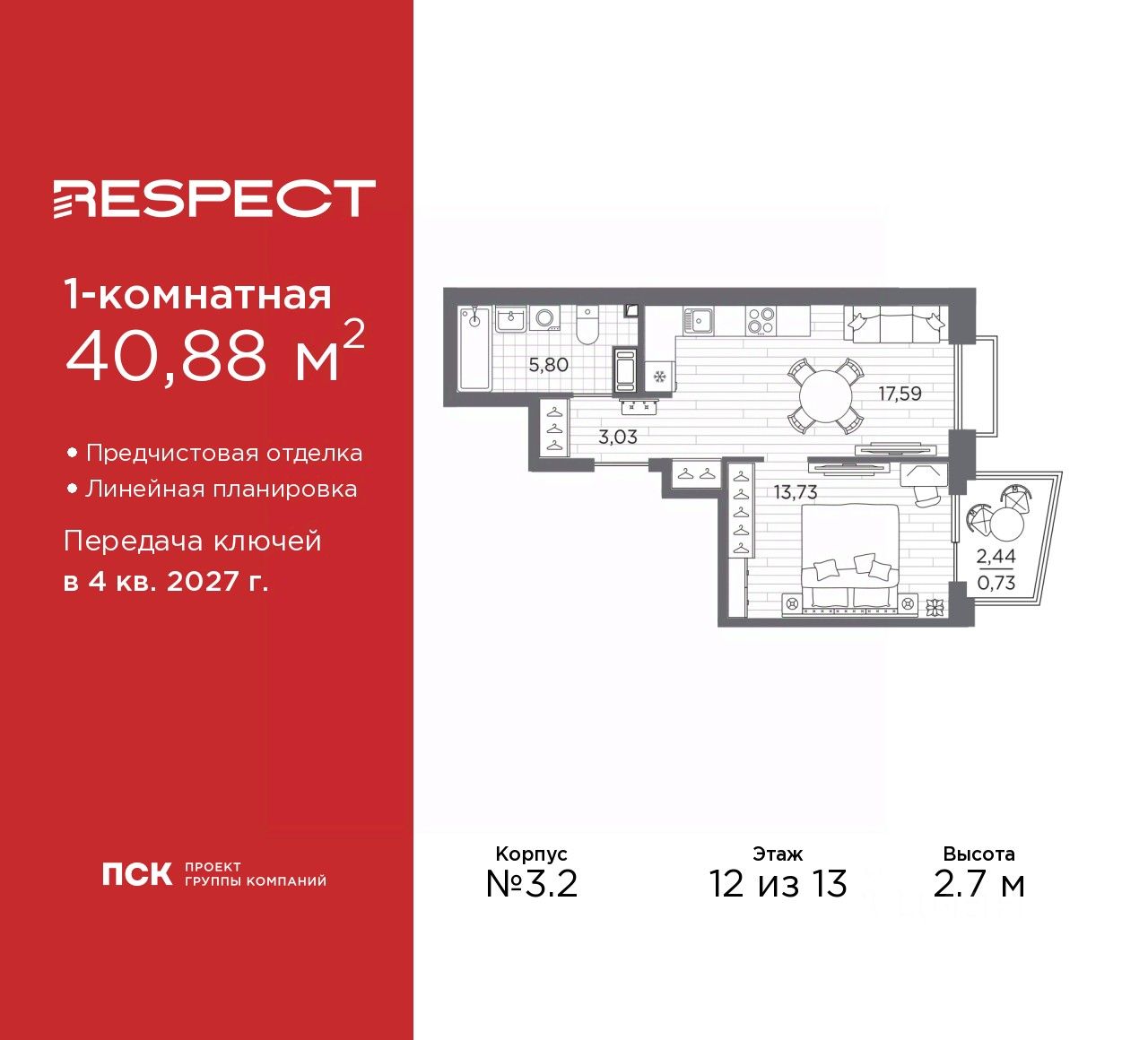Просторная однокомнатная квартира с предчистовой отделкой в ЖК ''RESPECT'' на 7 этаже. Общая площадь: 41.09 кв.м., жилая: 13.19 кв.м., площадь просторной кухни-столовой: 14.49 кв.м. Все окна выходят на одну сторону. В квартире одна лоджия, один совмещенный санузел. Высота потолков 2.7 м. Дом монолитный, многоподъездный, переменной этажности, от 10 до 13 этажей. Квартира находится в 1-й секции высотой 13 этажей в корпусе 3.2. На этаже 5 квартир. В подъезде 1 пассажирский и 1 грузовой лифт. Начало строительства - 3 квартал 2025 года. Окончание строительства - 4 квартал 2027 года. Оформление сделки по договору долевого участия. В шаговой доступности от жилого комплекса имеются станции метро (расстояние по прямой): ''Лесная'' (800 м), ''Площадь Мужества'' (1.4 км), ''Выборгская'' (1.9 км), также недалеко от этого корпуса расположены станции метро: ''Академическая'', ''Политехническая''. Жилой квартал ''RESPECT'' строится на Полюстровском пр, 87, в одной из самых востребованных локаций Петербурга. В 10 минутах пешком - метро ''Лесная'' и в 10 минутах на транспорте - Петроградская сторона. Высота домов от 7 до 13 этажей. Квартиры сдаются с отделкой white box и с чистовой отделкой. На территории Respect строится школа на 1125 учащихся и детский сад на 240 мест. Запроектированы собственная газовая котельная, закрытая территория, дворы без машин и подземные паркинги с лифтами.В проекте предусмотрены трапециевидные балконы или остекленные лоджии, которые, с одной стороны, исключают монотонность фасада, являясь декоративными элементами, с другой дополнительным функциональным пространством в квартирах. Цветовая гармония фасадов каждого дома раскрывает характер квартала. Коричневый цвет клинкерного кирпича со структурой водяных штрихов — цвет уюта и безопасности, сдержанности и надёжности. Вентилируемые фасады облицованы клинкерным кирпичом. Его высокая прочность позволяет давать 100 лет гарантии на этот материал. Водопоглощение клинкерного кирпича составляет менее 5%, за счет чего у него высокая теплопроводность и прочность. В квартале запроектированы внутренние закрытые территории дворов домов без доступа автомобилей и безбарьерная среда для велосипедистов и колясок. Предусмотрены IP-домофония с функцией дистанционного открывания калиток и парадных, а также дистанционный сбор показаний счетчиков и мобильное приложение для жителей. Для безопасности жителей квартала - круглосуточное видеонаблюдение и служба охраны. В каждой квартире предусмотрены внешние корзины для кондиционеров. Вся территория квартала будет связана единой концепцией благоустройства, разработанной ландшафтным бюро L.BURO. На эксплуатируемой кровле на уровне первого этажа в домах 1 и 4 будут обустроены общественные видовые террасы. Это станет не только привлекательным местом с красивым видом, но и удобным, многофункциональным пространством. Дизайн парадных зон и входных групп - сочетание лаконичности отделки и декоративных элементов с текстурами из натурального камня и дерева с приг