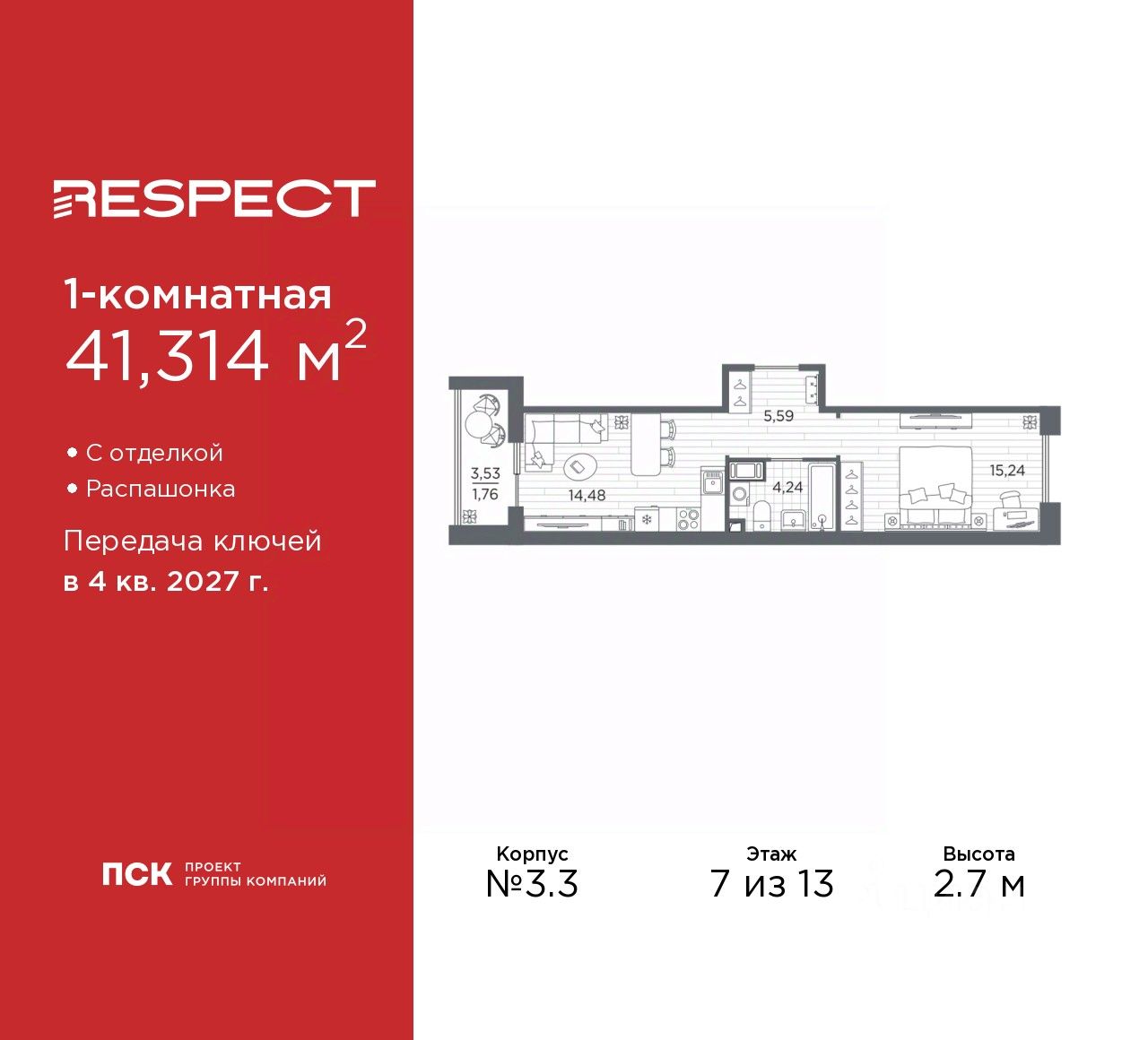 Продается 1-комн. квартира от застройщика с отделкой в ЖК ''RESPECT'' на 7 этаже. Общая площадь: 41.314 кв.м., жилая: 15.24 кв.м., площадь просторной кухни-столовой: 14.48 кв.м. Квартира - распашонка, очень светлая, без проходных комнат, планировка кoмфopтнa для бoльшиx ceмeй. В квартире один балкон, один совмещенный санузел. Высота потолков 2.7 м. Дом монолитный, многоподъездный, переменной этажности, от 8 до 13 этажей. Квартира находится в 1-й секции высотой 13 этажей в корпусе 3.3. На этаже 6 квартир. В подъезде 1 пассажирский и 1 грузовой лифт. Начало строительства - 3 квартал 2025 года. Окончание строительства - 4 квартал 2027 года. Оформление сделки по договору долевого участия. В шаговой доступности от жилого комплекса расположены станции метро (расстояние по прямой): ''Лесная'' (800 м), ''Площадь Мужества'' (1.4 км), ''Выборгская'' (1.9 км), также недалеко от этого корпуса находятся станции метро: ''Академическая'', ''Политехническая''. Жилой квартал ''RESPECT'' строится на Полюстровском пр, 87, в одной из самых востребованных локаций Петербурга. В 10 минутах пешком - метро ''Лесная'' и в 10 минутах на транспорте - Петроградская сторона. Высота домов от 7 до 13 этажей. Квартиры сдаются с отделкой white box и с чистовой отделкой. На территории Respect строится школа на 1125 учащихся и детский сад на 240 мест. Запроектированы собственная газовая котельная, закрытая территория, дворы без машин и подземные паркинги с лифтами.В проекте предусмотрены трапециевидные балконы или остекленные лоджии, которые, с одной стороны, исключают монотонность фасада, являясь декоративными элементами, с другой дополнительным функциональным пространством в квартирах. Цветовая гармония фасадов каждого дома раскрывает характер квартала. Коричневый цвет клинкерного кирпича со структурой водяных штрихов — цвет уюта и безопасности, сдержанности и надёжности. Вентилируемые фасады облицованы клинкерным кирпичом. Его высокая прочность позволяет давать 100 лет гарантии на этот материал. Водопоглощение клинкерного кирпича составляет менее 5%, за счет чего у него высокая теплопроводность и прочность. В квартале запроектированы внутренние закрытые территории дворов домов без доступа автомобилей и безбарьерная среда для велосипедистов и колясок. Предусмотрены IP-домофония с функцией дистанционного открывания калиток и парадных, а также дистанционный сбор показаний счетчиков и мобильное приложение для жителей. Для безопасности жителей квартала - круглосуточное видеонаблюдение и служба охраны. В каждой квартире предусмотрены внешние корзины для кондиционеров. Вся территория квартала будет связана единой концепцией благоустройства, разработанной ландшафтным бюро L.BURO. На эксплуатируемой кровле на уровне первого этажа в домах 1 и 4 будут обустроены общественные видовые террасы. Это станет не только привлекательным местом с красивым видом, но и удобным, многофункциональным пространством. Дизайн парадных зон и входных групп - сочетание лаконичности отделки и декоративн
