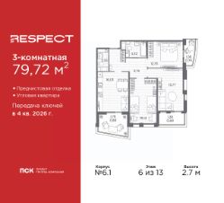 Просторная 3-комн. квартира с предчистовой отделкой в ЖК ''RESPECT'' на 6 этаже. Общая площадь: 79.72 кв.м., жилая: 44.24 кв.м., площадь просторной кухни-столовой: 16.03 кв.м. Квартира угловая, очень светлая, естественная вентиляция при открытии окон. В квартире один балкон и две лоджии, один совмещенный и один раздельный санузел. Высота потолков 2.7 м. Квартира будет сдана с отделкой WHITE BOX, в которую включены следующие виды работ:- заливка стяжки,- установлена система отопления квартиры,- подготовлены потолки,- все стены выровнены, загрунтованы и отштукатурены,- электрическая проводка разведена по комнатам.Квартира будет готова к чистовой отделке. Квартира находится в корпусе 6. Дом монолитный, одноподъездный, высотой 13 этажей. На этаже 8 квартир. В подъезде 1 пассажирский и 1 грузовой лифт. Окончание строительства - 4 квартал 2026 года. Оформление сделки по договору долевого участия. В шаговой доступности от жилого комплекса находятся станции метро (расстояние по прямой): ''Лесная'' (800 м), ''Площадь Мужества'' (1.4 км), ''Выборгская'' (1.9 км), также недалеко от этого корпуса находятся станции метро: ''Академическая'', ''Политехническая''. Квартал строится на Полюстровском пр, 87, в одной из самых востребованных локаций Петербурга. В 10 минутах пешком - метро ''Лесная'' и в 10 минутах на транспорте - Петроградская сторона. Высота домов от 7 до 13 этажей. На территории Respect строится школа на 1125 учащихся и детский сад на 240 мест. Запроектированы собственная газовая котельная, закрытая территория, дворы без машин и подземные паркинги с лифтами. Вентилируемые фасады облицованы клинкерным кирпичом. Дома из этого материала служат веками, являясь гордостью хозяев. Дизайн парадных зон и входных групп - сочетание лаконичности отделки и декоративных элементов с текстурами из натурального камня и дерева с приглушенной подсветкой теплым светом. Во входных группах расположены гостевые зоны с мягкой мебелью. Вся территория квартала будет связана единой концепцией благоустройства, разработанной ландшафтным бюро L.BURO. В основе - идея создания увлекательного ландшафтного пространства для насыщенной жизни, включающего в себя пейзажные зоны, современные архитектурные композиции, открытые террасы на стилобатах с зонами отдыха и парклетами, спортивными площадками. Это пространство для людей всех возрастов и различных увлечений. На эксплуатируемой кровле на уровне первого этажа в домах 1 и 4 будут обустроены общественные видовые террасы. В квартале запроектированы внутренние закрытые территории дворов домов без доступа автомобилей и безбарьерная среда для велосипедистов и колясок. Предусмотрены IP-домофония с функцией дистанционного открывания калиток и парадных, а также дистанционный сбор показаний счетчиков и мобильное приложение для жителей. Для безопасности жителей квартала - круглосуточное видеонаблюдение и служба охраны. В каждой квартире предусмотрены внешние корзины для кондиционеров. #ZmcelB