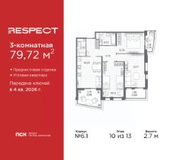 Просторная трехкомнатная квартира с предчистовой отделкой в ЖК ''RESPECT'' на 10 этаже. Общая площадь: 79.72 кв.м., жилая: 44.24 кв.м., площадь просторной кухни-столовой: 16.03 кв.м. Квартира угловая, очень светлая, естественная вентиляция при открытии окон. В квартире один балкон и две лоджии, один совмещенный и один раздельный санузел. Высота потолков 2.7 м. Квартира будет сдана с отделкой WHITE BOX, в которую включены следующие виды работ:- заливка стяжки,- установлена система отопления квартиры,- подготовлены потолки,- все стены выровнены, загрунтованы и отштукатурены,- электрическая проводка разведена по комнатам.Квартира будет готова к чистовой отделке. Квартира находится в корпусе 6. Дом монолитный, одноподъездный, высотой 13 этажей. На этаже 8 квартир. В подъезде 1 пассажирский и 1 грузовой лифт. Окончание строительства - 4 квартал 2026 года. Оформление сделки по договору долевого участия. В шаговой доступности от жилого комплекса имеются станции метро (расстояние по прямой): ''Лесная'' (800 м), ''Площадь Мужества'' (1.4 км), ''Выборгская'' (1.9 км), также недалеко от этого корпуса расположены станции метро: ''Академическая'', ''Политехническая''. Квартал строится на Полюстровском пр, 87, в одной из самых востребованных локаций Петербурга. В 10 минутах пешком - метро ''Лесная'' и в 10 минутах на транспорте - Петроградская сторона. Высота домов от 7 до 13 этажей. На территории Respect строится школа на 1125 учащихся и детский сад на 240 мест. Запроектированы собственная газовая котельная, закрытая территория, дворы без машин и подземные паркинги с лифтами. Вентилируемые фасады облицованы клинкерным кирпичом. Дома из этого материала служат веками, являясь гордостью хозяев. Дизайн парадных зон и входных групп - сочетание лаконичности отделки и декоративных элементов с текстурами из натурального камня и дерева с приглушенной подсветкой теплым светом. Во входных группах расположены гостевые зоны с мягкой мебелью. Вся территория квартала будет связана единой концепцией благоустройства, разработанной ландшафтным бюро L.BURO. В основе - идея создания увлекательного ландшафтного пространства для насыщенной жизни, включающего в себя пейзажные зоны, современные архитектурные композиции, открытые террасы на стилобатах с зонами отдыха и парклетами, спортивными площадками. Это пространство для людей всех возрастов и различных увлечений. На эксплуатируемой кровле на уровне первого этажа в домах 1 и 4 будут обустроены общественные видовые террасы. В квартале запроектированы внутренние закрытые территории дворов домов без доступа автомобилей и безбарьерная среда для велосипедистов и колясок. Предусмотрены IP-домофония с функцией дистанционного открывания калиток и парадных, а также дистанционный сбор показаний счетчиков и мобильное приложение для жителей. Для безопасности жителей квартала - круглосуточное видеонаблюдение и служба охраны. В каждой квартире предусмотрены внешние корзины для кондиционеров. #zmCEiD