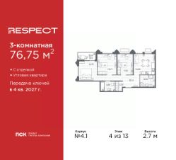 Трехкомнатная квартира с отделкой в ЖК ''RESPECT'' на 4 этаже. Общая площадь: 76.75 кв.м., жилая: 37.56 кв.м., площадь просторной кухни-столовой: 14.59 кв.м. Квартира угловая, очень светлая, естественная вентиляция при открытии окон. В квартире одна лоджия, два совмещенных санузла. Высота потолков 2.7 м. Квартира находится в корпусе 4.1. Дом монолитный, одноподъездный, высотой 13 этажей. На этаже 7 квартир. В подъезде 1 пассажирский и 1 грузовой лифт. Начало строительства - 1 квартал 2026 года. Окончание строительства - 4 квартал 2027 года. Оформление сделки по договору долевого участия. В шаговой доступности от жилого комплекса расположены станции метро (расстояние по прямой): ''Лесная'' (800 м), ''Площадь Мужества'' (1.4 км), ''Выборгская'' (1.9 км), также недалеко от этого корпуса находятся станции метро: ''Академическая'', ''Политехническая''. Квартал строится на Полюстровском пр, 87, в одной из самых востребованных локаций Петербурга. В 10 минутах пешком - метро ''Лесная'' и в 10 минутах на транспорте - Петроградская сторона. Высота домов от 7 до 13 этажей. На территории Respect строится школа на 1125 учащихся и детский сад на 240 мест. Запроектированы собственная газовая котельная, закрытая территория, дворы без машин и подземные паркинги с лифтами. Вентилируемые фасады облицованы клинкерным кирпичом. Дома из этого материала служат веками, являясь гордостью хозяев. Дизайн парадных зон и входных групп - сочетание лаконичности отделки и декоративных элементов с текстурами из натурального камня и дерева с приглушенной подсветкой теплым светом. Во входных группах расположены гостевые зоны с мягкой мебелью. Вся территория квартала будет связана единой концепцией благоустройства, разработанной ландшафтным бюро L.BURO. В основе - идея создания увлекательного ландшафтного пространства для насыщенной жизни, включающего в себя пейзажные зоны, современные архитектурные композиции, открытые террасы на стилобатах с зонами отдыха и парклетами, спортивными площадками. Это пространство для людей всех возрастов и различных увлечений. На эксплуатируемой кровле на уровне первого этажа в домах 1 и 4 будут обустроены общественные видовые террасы. В квартале запроектированы внутренние закрытые территории дворов домов без доступа автомобилей и безбарьерная среда для велосипедистов и колясок. Предусмотрены IP-домофония с функцией дистанционного открывания калиток и парадных, а также дистанционный сбор показаний счетчиков и мобильное приложение для жителей. Для безопасности жителей квартала - круглосуточное видеонаблюдение и служба охраны. В каждой квартире предусмотрены внешние корзины для кондиционеров. #2mdBu4