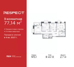 Просторная 3-комн. квартира с предчистовой отделкой в ЖК ''RESPECT'' на 8 этаже. Общая площадь: 77.14 кв.м., жилая: 37.67 кв.м., площадь просторной кухни-столовой: 13.97 кв.м. Угловая квартира, очень светлая, естественная вентиляция при открытии окон. В квартире одна лоджия, два совмещенных санузла. Высота потолков 2.7 м. Квартира находится в корпусе 5.1. Дом монолитный, одноподъездный, высотой 13 этажей. На этаже 7 квартир. В подъезде 1 пассажирский и 1 грузовой лифт. Начало строительства - 1 квартал 2026 года. Окончание строительства - 4 квартал 2027 года. Оформление сделки по договору долевого участия. В шаговой доступности от жилого комплекса имеются станции метро (расстояние по прямой): ''Лесная'' (800 м), ''Площадь Мужества'' (1.4 км), ''Выборгская'' (1.9 км), также недалеко от этого корпуса расположены станции метро: ''Академическая'', ''Политехническая''. Жилой квартал ''RESPECT'' строится на Полюстровском пр, 87, в одной из самых востребованных локаций Петербурга. В 10 минутах пешком - метро ''Лесная'' и в 10 минутах на транспорте - Петроградская сторона. Высота домов от 7 до 13 этажей. Квартиры сдаются с отделкой white box и с чистовой отделкой. На территории Respect строится школа на 1125 учащихся и детский сад на 240 мест. Запроектированы собственная газовая котельная, закрытая территория, дворы без машин и подземные паркинги с лифтами.В проекте предусмотрены трапециевидные балконы или остекленные лоджии, которые, с одной стороны, исключают монотонность фасада, являясь декоративными элементами, с другой дополнительным функциональным пространством в квартирах. Цветовая гармония фасадов каждого дома раскрывает характер квартала. Коричневый цвет клинкерного кирпича со структурой водяных штрихов — цвет уюта и безопасности, сдержанности и надёжности. Вентилируемые фасады облицованы клинкерным кирпичом. Его высокая прочность позволяет давать 100 лет гарантии на этот материал. Водопоглощение клинкерного кирпича составляет менее 5%, за счет чего у него высокая теплопроводность и прочность. В квартале запроектированы внутренние закрытые территории дворов домов без доступа автомобилей и безбарьерная среда для велосипедистов и колясок. Предусмотрены IP-домофония с функцией дистанционного открывания калиток и парадных, а также дистанционный сбор показаний счетчиков и мобильное приложение для жителей. Для безопасности жителей квартала - круглосуточное видеонаблюдение и служба охраны. В каждой квартире предусмотрены внешние корзины для кондиционеров. Вся территория квартала будет связана единой концепцией благоустройства, разработанной ландшафтным бюро L.BURO. На эксплуатируемой кровле на уровне первого этажа в домах 1 и 4 будут обустроены общественные видовые террасы. Это станет не только привлекательным местом с красивым видом, но и удобным, многофункциональным пространством. Дизайн парадных зон и входных групп - сочетание лаконичности отделки и декоративных элементов с текстурами из натурального камня и дерева с приглушенной подсветкой