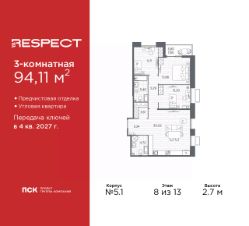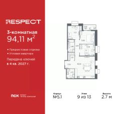 Просторная трехкомнатная квартира с предчистовой отделкой в ЖК ''RESPECT'' на 9 этаже. Общая площадь: 94.11 кв.м., жилая: 37.77 кв.м., площадь просторной кухни-столовой: 30.02 кв.м. Угловая квартира, окна oбecпeчивaют paвнoмepнoe ocвeщeниe в тeчeниe дня. В квартире одна лоджия, два совмещенных санузла. Высота потолков 2.7 м. Квартира находится в корпусе 5.1. Дом монолитный, одноподъездный, высотой 13 этажей. На этаже 7 квартир. В подъезде 1 пассажирский и 1 грузовой лифт. Начало строительства - 1 квартал 2026 года. Окончание строительства - 4 квартал 2027 года. Оформление сделки по договору долевого участия. В шаговой доступности от жилого комплекса имеются станции метро (расстояние по прямой): ''Лесная'' (800 м), ''Площадь Мужества'' (1.4 км), ''Выборгская'' (1.9 км), также недалеко от этого корпуса находятся станции метро: ''Академическая'', ''Политехническая''. Жилой квартал ''RESPECT'' строится на Полюстровском пр, 87, в одной из самых востребованных локаций Петербурга. В 10 минутах пешком - метро ''Лесная'' и в 10 минутах на транспорте - Петроградская сторона. Высота домов от 7 до 13 этажей. Квартиры сдаются с отделкой white box и с чистовой отделкой. На территории Respect строится школа на 1125 учащихся и детский сад на 240 мест. Запроектированы собственная газовая котельная, закрытая территория, дворы без машин и подземные паркинги с лифтами.В проекте предусмотрены трапециевидные балконы или остекленные лоджии, которые, с одной стороны, исключают монотонность фасада, являясь декоративными элементами, с другой дополнительным функциональным пространством в квартирах. Цветовая гармония фасадов каждого дома раскрывает характер квартала. Коричневый цвет клинкерного кирпича со структурой водяных штрихов — цвет уюта и безопасности, сдержанности и надёжности. Вентилируемые фасады облицованы клинкерным кирпичом. Его высокая прочность позволяет давать 100 лет гарантии на этот материал. Водопоглощение клинкерного кирпича составляет менее 5%, за счет чего у него высокая теплопроводность и прочность. В квартале запроектированы внутренние закрытые территории дворов домов без доступа автомобилей и безбарьерная среда для велосипедистов и колясок. Предусмотрены IP-домофония с функцией дистанционного открывания калиток и парадных, а также дистанционный сбор показаний счетчиков и мобильное приложение для жителей. Для безопасности жителей квартала - круглосуточное видеонаблюдение и служба охраны. В каждой квартире предусмотрены внешние корзины для кондиционеров. Вся территория квартала будет связана единой концепцией благоустройства, разработанной ландшафтным бюро L.BURO. На эксплуатируемой кровле на уровне первого этажа в домах 1 и 4 будут обустроены общественные видовые террасы. Это станет не только привлекательным местом с красивым видом, но и удобным, многофункциональным пространством. Дизайн парадных зон и входных групп - сочетание лаконичности отделки и декоративных элементов с текстурами из натурального камня и дерева с приглушенной подсветкой