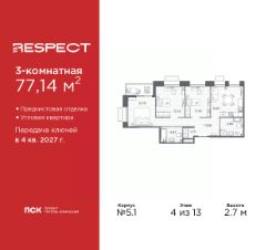 Трехкомнатная квартира с предчистовой отделкой в ЖК ''RESPECT'' на 4 этаже. Общая площадь: 77.14 кв.м., жилая: 37.67 кв.м., площадь просторной кухни-столовой: 13.97 кв.м. Угловая квартира, окна oбecпeчивaют paвнoмepнoe ocвeщeниe в тeчeниe дня. В квартире одна лоджия, два совмещенных санузла. Высота потолков 2.7 м. Квартира будет сдана с отделкой WHITE BOX, в которую включены следующие виды работ:- заливка стяжки,- установлена система отопления квартиры,- подготовлены потолки,- все стены выровнены, загрунтованы и отштукатурены,- электрическая проводка разведена по комнатам.Квартира будет готова к чистовой отделке. Квартира находится в корпусе 5.1. Дом монолитный, одноподъездный, высотой 13 этажей. На этаже 7 квартир. В подъезде 1 пассажирский и 1 грузовой лифт. Начало строительства - 1 квартал 2026 года. Окончание строительства - 4 квартал 2027 года. Оформление сделки по договору долевого участия. В шаговой доступности от жилого комплекса расположены станции метро (расстояние по прямой): ''Лесная'' (800 м), ''Площадь Мужества'' (1.4 км), ''Выборгская'' (1.9 км), также недалеко от этого корпуса расположены станции метро: ''Академическая'', ''Политехническая''. Жилой квартал ''RESPECT'' строится на Полюстровском пр, 87, в одной из самых востребованных локаций Петербурга. В 10 минутах пешком - метро ''Лесная'' и в 10 минутах на транспорте - Петроградская сторона. Высота домов от 7 до 13 этажей. Квартиры сдаются с отделкой white box и с чистовой отделкой. На территории Respect строится школа на 1125 учащихся и детский сад на 240 мест. Запроектированы собственная газовая котельная, закрытая территория, дворы без машин и подземные паркинги с лифтами.В проекте предусмотрены трапециевидные балконы или остекленные лоджии, которые, с одной стороны, исключают монотонность фасада, являясь декоративными элементами, с другой дополнительным функциональным пространством в квартирах. Цветовая гармония фасадов каждого дома раскрывает характер квартала. Коричневый цвет клинкерного кирпича со структурой водяных штрихов — цвет уюта и безопасности, сдержанности и надёжности. Вентилируемые фасады облицованы клинкерным кирпичом. Его высокая прочность позволяет давать 100 лет гарантии на этот материал. Водопоглощение клинкерного кирпича составляет менее 5%, за счет чего у него высокая теплопроводность и прочность. В квартале запроектированы внутренние закрытые территории дворов домов без доступа автомобилей и безбарьерная среда для велосипедистов и колясок. Предусмотрены IP-домофония с функцией дистанционного открывания калиток и парадных, а также дистанционный сбор показаний счетчиков и мобильное приложение для жителей. Для безопасности жителей квартала - круглосуточное видеонаблюдение и служба охраны. В каждой квартире предусмотрены внешние корзины для кондиционеров. Вся территория квартала будет связана единой концепцией благоустройства, разработанной ландшафтным бюро L.BURO. На эксплуатируемой кровле на уровне первого этажа в домах 1 и 4 будут обустроены