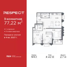 Просторная трехкомнатная квартира с отделкой в ЖК ''RESPECT'' на 4 этаже. Общая площадь: 77.22 кв.м., жилая: 34.78 кв.м., площадь просторной кухни-столовой: 24.95 кв.м. Угловая квартира, окна oбecпeчивaют paвнoмepнoe ocвeщeниe в тeчeниe дня. В квартире одна лоджия, два совмещенных санузла. Высота потолков 2.7 м. Квартира находится в корпусе 4.1. Дом монолитный, одноподъездный, высотой 13 этажей. На этаже 7 квартир. В подъезде 1 пассажирский и 1 грузовой лифт. Начало строительства - 1 квартал 2026 года. Окончание строительства - 4 квартал 2027 года. Оформление сделки по договору долевого участия. В шаговой доступности от жилого комплекса расположены станции метро (расстояние по прямой): ''Лесная'' (800 м), ''Площадь Мужества'' (1.4 км), ''Выборгская'' (1.9 км), также недалеко от этого корпуса расположены станции метро: ''Академическая'', ''Политехническая''. Жилой квартал ''RESPECT'' строится на Полюстровском пр, 87, в одной из самых востребованных локаций Петербурга. В 10 минутах пешком - метро ''Лесная'' и в 10 минутах на транспорте - Петроградская сторона. Высота домов от 7 до 13 этажей. Квартиры сдаются с отделкой white box и с чистовой отделкой. На территории Respect строится школа на 1125 учащихся и детский сад на 240 мест. Запроектированы собственная газовая котельная, закрытая территория, дворы без машин и подземные паркинги с лифтами.В проекте предусмотрены трапециевидные балконы или остекленные лоджии, которые, с одной стороны, исключают монотонность фасада, являясь декоративными элементами, с другой дополнительным функциональным пространством в квартирах. Цветовая гармония фасадов каждого дома раскрывает характер квартала. Коричневый цвет клинкерного кирпича со структурой водяных штрихов — цвет уюта и безопасности, сдержанности и надёжности. Вентилируемые фасады облицованы клинкерным кирпичом. Его высокая прочность позволяет давать 100 лет гарантии на этот материал. Водопоглощение клинкерного кирпича составляет менее 5%, за счет чего у него высокая теплопроводность и прочность. В квартале запроектированы внутренние закрытые территории дворов домов без доступа автомобилей и безбарьерная среда для велосипедистов и колясок. Предусмотрены IP-домофония с функцией дистанционного открывания калиток и парадных, а также дистанционный сбор показаний счетчиков и мобильное приложение для жителей. Для безопасности жителей квартала - круглосуточное видеонаблюдение и служба охраны. В каждой квартире предусмотрены внешние корзины для кондиционеров. Вся территория квартала будет связана единой концепцией благоустройства, разработанной ландшафтным бюро L.BURO. На эксплуатируемой кровле на уровне первого этажа в домах 1 и 4 будут обустроены общественные видовые террасы. Это станет не только привлекательным местом с красивым видом, но и удобным, многофункциональным пространством. Дизайн парадных зон и входных групп - сочетание лаконичности отделки и декоративных элементов с текстурами из натурального камня и дерева с приглушенной подсветкой теплым