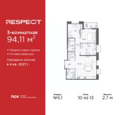 Продается 3-комн. квартира с предчистовой отделкой в ЖК ''RESPECT'' на 10 этаже. Общая площадь: 94.11 кв.м., жилая: 37.77 кв.м., площадь просторной кухни-столовой: 30.02 кв.м. Квартира угловая, очень светлая, естественная вентиляция при открытии окон. В квартире одна лоджия, два совмещенных санузла. Высота потолков 2.7 м. Квартира будет сдана с отделкой WHITE BOX, в которую включены следующие виды работ:- заливка стяжки,- установлена система отопления квартиры,- подготовлены потолки,- все стены выровнены, загрунтованы и отштукатурены,- электрическая проводка разведена по комнатам.Квартира будет готова к чистовой отделке. Квартира находится в корпусе 5.1. Дом монолитный, одноподъездный, высотой 13 этажей. На этаже 7 квартир. В подъезде 1 пассажирский и 1 грузовой лифт. Начало строительства - 1 квартал 2026 года. Окончание строительства - 4 квартал 2027 года. Оформление сделки по договору долевого участия. В шаговой доступности от жилого комплекса расположены станции метро (расстояние по прямой): ''Лесная'' (800 м), ''Площадь Мужества'' (1.4 км), ''Выборгская'' (1.9 км), также недалеко от этого корпуса находятся станции метро: ''Академическая'', ''Политехническая''. Жилой квартал ''RESPECT'' строится на Полюстровском пр, 87, в одной из самых востребованных локаций Петербурга. В 10 минутах пешком - метро ''Лесная'' и в 10 минутах на транспорте - Петроградская сторона. Высота домов от 7 до 13 этажей. Квартиры сдаются с отделкой white box и с чистовой отделкой. На территории Respect строится школа на 1125 учащихся и детский сад на 240 мест. Запроектированы собственная газовая котельная, закрытая территория, дворы без машин и подземные паркинги с лифтами.В проекте предусмотрены трапециевидные балконы или остекленные лоджии, которые, с одной стороны, исключают монотонность фасада, являясь декоративными элементами, с другой дополнительным функциональным пространством в квартирах. Цветовая гармония фасадов каждого дома раскрывает характер квартала. Коричневый цвет клинкерного кирпича со структурой водяных штрихов — цвет уюта и безопасности, сдержанности и надёжности. Вентилируемые фасады облицованы клинкерным кирпичом. Его высокая прочность позволяет давать 100 лет гарантии на этот материал. Водопоглощение клинкерного кирпича составляет менее 5%, за счет чего у него высокая теплопроводность и прочность. В квартале запроектированы внутренние закрытые территории дворов домов без доступа автомобилей и безбарьерная среда для велосипедистов и колясок. Предусмотрены IP-домофония с функцией дистанционного открывания калиток и парадных, а также дистанционный сбор показаний счетчиков и мобильное приложение для жителей. Для безопасности жителей квартала - круглосуточное видеонаблюдение и служба охраны. В каждой квартире предусмотрены внешние корзины для кондиционеров. Вся территория квартала будет связана единой концепцией благоустройства, разработанной ландшафтным бюро L.BURO. На эксплуатируемой кровле на уровне первого этажа в домах 1 и 4 будут обус
