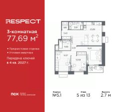 Просторная 3-комн. квартира с предчистовой отделкой в ЖК ''RESPECT'' на 9 этаже. Общая площадь: 77.69 кв.м., жилая: 35.87 кв.м., площадь просторной кухни-столовой: 23.89 кв.м. Квартира угловая, окна oбecпeчивaют paвнoмepнoe ocвeщeниe в тeчeниe дня. В квартире одна лоджия, два совмещенных санузла. Высота потолков 2.7 м. Квартира находится в корпусе 5.1. Дом монолитный, одноподъездный, высотой 13 этажей. На этаже 7 квартир. В подъезде 1 пассажирский и 1 грузовой лифт. Начало строительства - 1 квартал 2026 года. Окончание строительства - 4 квартал 2027 года. Оформление сделки по договору долевого участия. В шаговой доступности от жилого комплекса имеются станции метро (расстояние по прямой): ''Лесная'' (800 м), ''Площадь Мужества'' (1.4 км), ''Выборгская'' (1.9 км), также недалеко от этого корпуса находятся станции метро: ''Академическая'', ''Политехническая''. Жилой квартал ''RESPECT'' строится на Полюстровском пр, 87, в одной из самых востребованных локаций Петербурга. В 10 минутах пешком - метро ''Лесная'' и в 10 минутах на транспорте - Петроградская сторона. Высота домов от 7 до 13 этажей. Квартиры сдаются с отделкой white box и с чистовой отделкой. На территории Respect строится школа на 1125 учащихся и детский сад на 240 мест. Запроектированы собственная газовая котельная, закрытая территория, дворы без машин и подземные паркинги с лифтами.В проекте предусмотрены трапециевидные балконы или остекленные лоджии, которые, с одной стороны, исключают монотонность фасада, являясь декоративными элементами, с другой дополнительным функциональным пространством в квартирах. Цветовая гармония фасадов каждого дома раскрывает характер квартала. Коричневый цвет клинкерного кирпича со структурой водяных штрихов — цвет уюта и безопасности, сдержанности и надёжности. Вентилируемые фасады облицованы клинкерным кирпичом. Его высокая прочность позволяет давать 100 лет гарантии на этот материал. Водопоглощение клинкерного кирпича составляет менее 5%, за счет чего у него высокая теплопроводность и прочность. В квартале запроектированы внутренние закрытые территории дворов домов без доступа автомобилей и безбарьерная среда для велосипедистов и колясок. Предусмотрены IP-домофония с функцией дистанционного открывания калиток и парадных, а также дистанционный сбор показаний счетчиков и мобильное приложение для жителей. Для безопасности жителей квартала - круглосуточное видеонаблюдение и служба охраны. В каждой квартире предусмотрены внешние корзины для кондиционеров. Вся территория квартала будет связана единой концепцией благоустройства, разработанной ландшафтным бюро L.BURO. На эксплуатируемой кровле на уровне первого этажа в домах 1 и 4 будут обустроены общественные видовые террасы. Это станет не только привлекательным местом с красивым видом, но и удобным, многофункциональным пространством. Дизайн парадных зон и входных групп - сочетание лаконичности отделки и декоративных элементов с текстурами из натурального камня и дерева с приглушенной подсветкой теплы