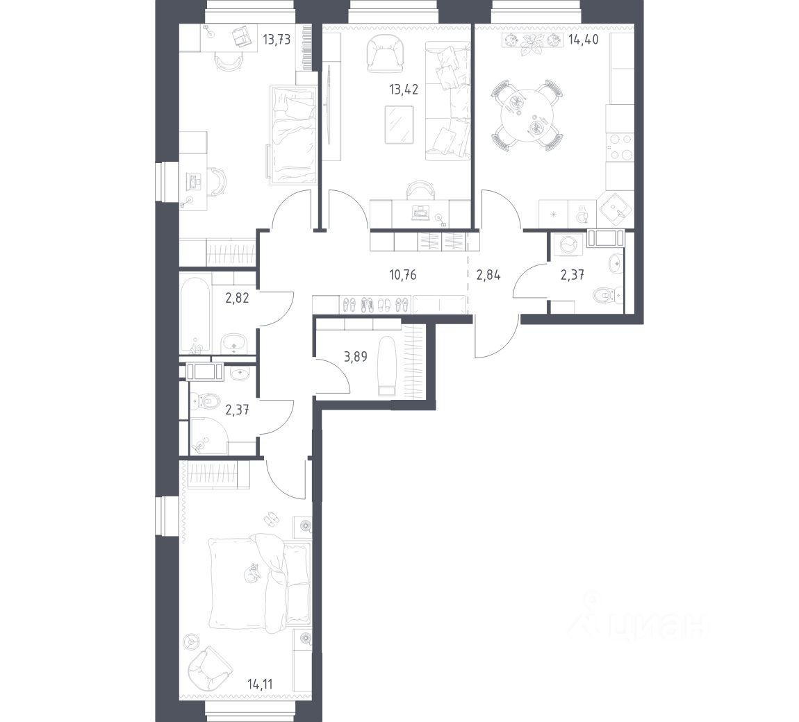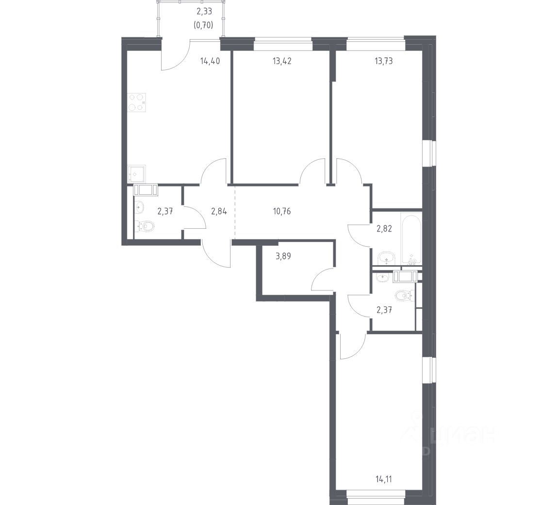 В продаже 3-комнатная квартира в корпусе 4 ЖК 'Живи! В Рыбацком'. Квартира располагается на 14 этаже, общая площадь 77.1 м2.