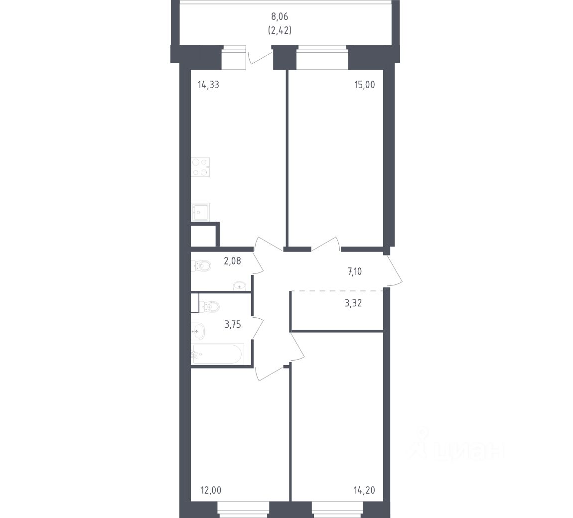 В продаже 3-комнатная квартира в корпусе 39 ЖК 'Живи! В Рыбацком'. Квартира располагается на 12 этаже, общая площадь 74.2 м2.