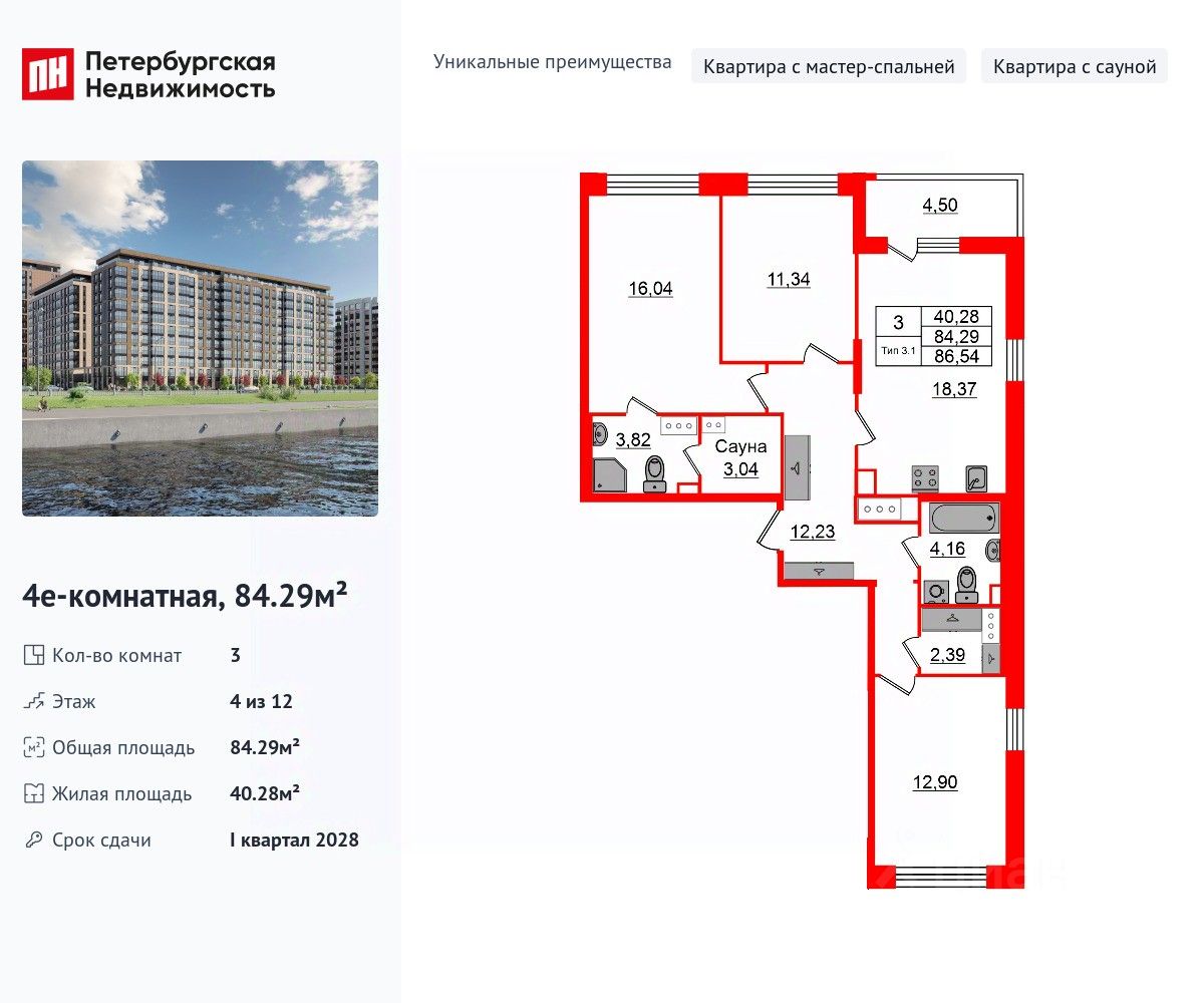 Продается уютная, семейная 3-комнатная квартира от застройщика в жилом комплексе ''Setl Ривьера'' в активно развивающимся Невском районе. До метро можно добраться на транспорте всего за 10 минут. Мастер-спальня с собственной ванной комнатой. Самое приватное пространство в вашей квартире. Сауна в ванной комнате. Расслабьтесь и восстановите силы, как в СПА-салоне. Уникальная, функциональная европланировка, большая кухня-гостиная 18.37 м², просторная прихожая 12.23 м². Общая площадь квартиры - 84.29 м², жилая 40.28 м², высота потолка 2.77 м. Квартира продается с отделкой ''NORD LINE WHITE ВК NEW''. Что особенного в ЖК ''Setl Ривьера''? • Первая береговая линия Невы. 5 км до центра Петербурга • ''Активити парк'' - пространство для занятий спортом и отдыха. ''Ривьера парк'' с променадом и панорамной ротондой • Масштабные дворы 10 000 кв.м. с авторским ландшафтным дизайном • Двухуровневые единые входные группы • Видовые квартиры с террасами, каминами и саунами