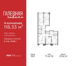 Продается четырехкомнатная квартира от застройщика в ЖК ''Галерная гавань'' на 11 этаже. Квартира без отделки, после оформления собственности можно делать ремонт. Общая площадь: 118.33 кв.м., жилая: 65.96 кв.м., площадь просторной кухни-столовой: 18.8 кв.м. Квартира - распашонка, без проходных комнат, окна выходят на paзные стороны дома. В квартире три совмещенных санузла. Высота потолков 3.02 м. Дом монолитный, трехподъездный, высотой 12 этажей. Квартира находится в 5-й секции в корпусе 3. На этаже 5 квартир. В подъезде 1 пассажирский и 1 грузовой лифт. Начало строительства - 4 квартал 2025 года. Окончание строительства - 3 квартал 2028 года. Оформление сделки по договору долевого участия. В шаговой доступности от жилого комплекса имеется станция метро (расстояние по прямой) ''Приморская'' (1.6 км), также недалеко от этого корпуса расположены станции метро: ''Горный институт'', ''Василеостровская'', ''Спортивная'', ''Крестовский остров''. ''Галерная гавань'' — это жилой комплекс бизнес-класса в исторической части Васильевского острова — на берегу Галерной гавани, ведущей свою историю с 1724 года.В свою очередь, исторический Васильевский остров это университеты, школы, детские сады, поликлиники, несколько станций метро и прочая инфраструктура без проблем с транспортной доступностью. В ''Галерной гавани'' шесть корпусов на 813 квартир, площадью от 29,5 до 134 кв.м. Высота потолков 3 м. Два корпуса из шести всего на 20 квартир. На верхних этажах расположатся квартиры с большими террасами и панорамным остеклением. Также есть квартиры с французскими балконами и мастер-спальнями. Четыре квартиры из каждых пяти с видами из окон на тихую воду, на старые и новые городские символы. Паркинг займет весь подземный объем квартала, и будет вмещать 606 автомобилей. Фасады ''Галерной гавани'' выполняются в стиле баварской кирпичной кладки, с акцентами из керамогранита графитового оттенка. Объемы задаются ризалитами с художественной подсветкой. Для жителей будет создан комьюнити-клуб с переговорной и библиотекой, кинозалом, кофе-поинтом, детской комнатой с пространством для мастер-классов, фитнес-зоной, а также бьюти-кабинетом. ''Галерная гавань'' — это также первый в Петербурге жилой комплекс с общественным пространством у воды. ГК ''ПСК'' восстановит десять исторических зданий, в которых расположатся рестораны, кафе, фитнес-клуб с бассейном, культурное пространство, театр и офисы. При этом набережная будет превращена в пешеходную, в территорию общественного пространства. #2mBa7i
