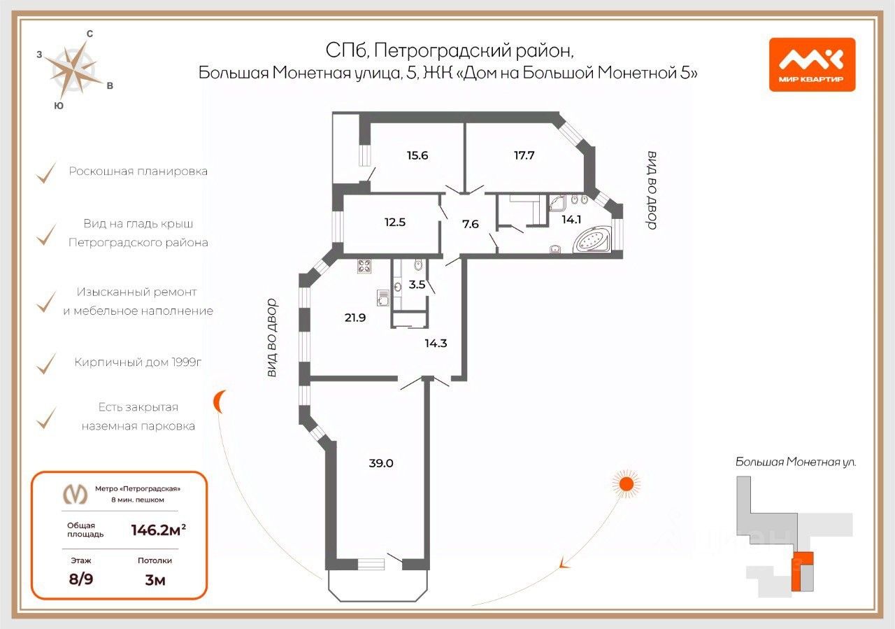 Арт. 128445402 Элитная квартира в ЖК ''Дом На Большой Монетной 5'' от застройщика York Development. Предлагаем стать владельцем роскошной квартиры в престижном районе города. Престижное расположение: Петроградский район — центральный, зелёный, один из самых развитых в городе. Исторически привлекал аристократию и творческую интеллигенцию, известен архитектурными шедеврами в стиле модерн. В 8 минутах ходьбы — станции метро ''Горьковская''и ''Петроградская''. Вблизи — вся необходимая инфраструктура и ключевые достопримечательности: Петропавловская крепость, Стрелка Васильевского Острова, Крейсер''Аврора'', Ботанический сад, Александровский парк, зоопарк. Преимущества жилого комплекса: Кирпичный дом (1999 г.) переменной этажности (49 эт.), стиль — модерн.Гармонично вписан в архитектурный ансамбль Петроградской стороны. Фасад: Штукатурка в шоколадных тонах, цоколь— натуральный камень. Встроенные гаражные боксы, коммерческие помещения (административные организации, торговые точки, сервис). Инженерное оснащение: трёхступенчатая фильтрация воды, отопительная система с разводкой из металлопластиковых труб, электроснабжение (15 кВт, трёхфазный ввод), централизованная автоматизация инженерных сетей. Бесшумные лифты Otis. Преимущества квартиры Уникальная планировка с панорамными видами (окна на 3 стороны). Премиальная отделка и мебель (Италия). 4 комнаты: 2 спальни, гостиная 39 кв. м, кабинет (возможно установить камин). 2 санузла: гостевой и семейный (сауна, двухместная джакузи с гидро и воздушным массажем, душевая, унитаз, биде). Просторный коридор со встроенной нишей для хранения (6570 см). 2 лоджии. 8й этаж. 2 квартиры на этаже — камерность и уединённость. Качественный ЖКС, доброжелательные соседи. Документы Приобретена по договору долевого участия. Один совершеннолетний собственник (личное присутствие на сделке). Без обременений и задолженностей. Прямая продажа. Не упустите шанс приобрести просторную семейную квартиру в престижном ЖК по особой цене! Звоните! Предлагаем ПРЕМИАЛЬНОЕ обслуживание для требовательных клиентов. Оперативно организуем просмотр, предоставим полную информацию по объекту. 20 лет работы с требовательными клиентами подготовили нас к решению ВАШИХ сложных задач. Будем рады знакомству! Ул. Рубинштейна, д.8.