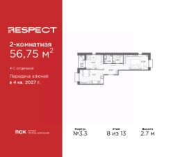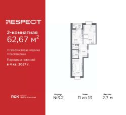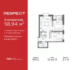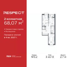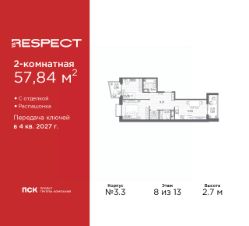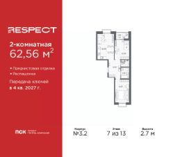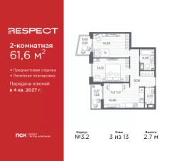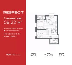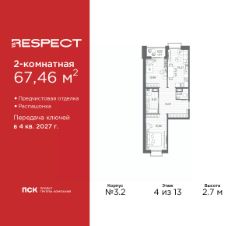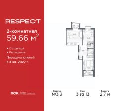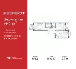 2-комн. квартира с отделкой в ЖК ''RESPECT'' на 4 этаже. Общая площадь: 57.59 кв.м., жилая: 25.54 кв.м., площадь просторной кухни-столовой: 15.11 кв.м. Комнаты изолированные, все окна выходят на одну сторону. В квартире один балкон, один совмещенный и один раздельный санузел. Высота потолков 2.7 м. В ЖК Respect представлены два варианта чистовой отделки: светлая и тёмная. Потолки: натяжные или выравнивание с окраской,Окна: из ПВХ профиля с двухкамерным стеклопакетом,Остекление балконов и лоджий: алюминиевое однослойное,Полы: покрытие из ламината, полы санузлов: керамическая плитка или керамогранит,Стены: обои под окраску, стены санузлов: керамическая плитка или керамогранит.Установлены межкомнатные двери.Санузел: раковина с тумбой, ванна или душевая кабина, унитаз, смесители. Выполнена полная разводка электропроводки. Дом монолитный, многоподъездный, переменной этажности, от 8 до 13 этажей. Квартира находится в 1-й секции высотой 13 этажей в корпусе 3.3. На этаже 6 квартир. В подъезде 1 пассажирский и 1 грузовой лифт. Начало строительства - 3 квартал 2025 года. Окончание строительства - 4 квартал 2027 года. Оформление сделки по договору долевого участия. В шаговой доступности от жилого комплекса имеются станции метро (расстояние по прямой): ''Лесная'' (800 м), ''Площадь Мужества'' (1.4 км), ''Выборгская'' (1.9 км), также недалеко от этого корпуса находятся станции метро: ''Академическая'', ''Политехническая''. Жилой квартал ''RESPECT'' строится на Полюстровском пр, 87, в одной из самых востребованных локаций Петербурга. В 10 минутах пешком - метро ''Лесная'' и в 10 минутах на транспорте - Петроградская сторона. Высота домов от 7 до 13 этажей. Квартиры сдаются с отделкой white box и с чистовой отделкой. На территории Respect строится школа на 1125 учащихся и детский сад на 240 мест. Запроектированы собственная газовая котельная, закрытая территория, дворы без машин и подземные паркинги с лифтами.В проекте предусмотрены трапециевидные балконы или остекленные лоджии, которые, с одной стороны, исключают монотонность фасада, являясь декоративными элементами, с другой дополнительным функциональным пространством в квартирах. Цветовая гармония фасадов каждого дома раскрывает характер квартала. Коричневый цвет клинкерного кирпича со структурой водяных штрихов — цвет уюта и безопасности, сдержанности и надёжности. Вентилируемые фасады облицованы клинкерным кирпичом. Его высокая прочность позволяет давать 100 лет гарантии на этот материал. Водопоглощение клинкерного кирпича составляет менее 5%, за счет чего у него высокая теплопроводность и прочность. В квартале запроектированы внутренние закрытые территории дворов домов без доступа автомобилей и безбарьерная среда для велосипедистов и колясок. Предусмотрены IP-домофония с функцией дистанционного открывания калиток и парадных, а также дистанционный сбор показаний счетчиков и мобильное приложение для жителей. Для безопасности жителей квартала - круглосуточное видеонаблюдение и служба охраны. В каж