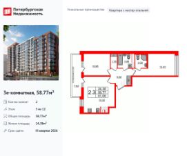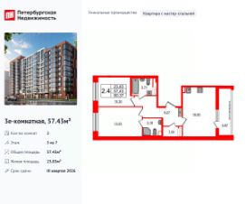 Продается уютная 2-комнатная квартира от застройщика в жилом комплексе ''Парадный ансамбль'' в престижном Московском районе. До метро можно добраться на транспорте всего за 20 минут. Удобная, классическая, функциональная европланировка, большая кухня-гостиная 17.3 м², вместительная прихожая 6.09 м². Общая площадь квартиры - 51.15 м², жилая 22.19 м², высота потолка 2.77 м. Квартира продается с отделкой ''Норд Лайн серый''. Что особенного в ЖК ''Парадный ансамбль''? • Инновационный Лицей Setl с оригинальной архитектурной концепцией и уникальной образовательной средой • Масштабное малоэтажное строительство в престижном Московском районе • Рекреационные зоны: парадный парк в центре квартала, ручей с собственной набережной, центральная площадь, ресторанный комплекс и пешеходный бульвар • Фасады из керамогранита и кирпича с яркими и акцентными входными группами • Две самые большие площадки Setl Kids и Setl Sport • Уникальные квартиры.High Flat на последних этажах, палисадники у квартир на первом этаже, семейные секции, квартиры с саунами и окном в ванной