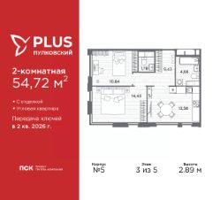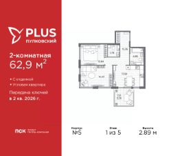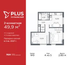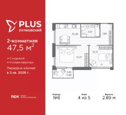 Двухкомнатная квартира от застройщика с отделкой в ЖК ''PLUS Пулковский'' на 3 этаже. Общая площадь: 47.5 кв.м., жилая: 24.6 кв.м., площадь просторной кухни-столовой: 10.5 кв.м. Угловая квартира, очень светлая, естественная вентиляция при открытии окон. В квартире один совмещенный санузел. Высота потолков 2.89 м. Дом монолитный, трехподъездный, высотой 5 этажей. Квартира находится в 1-й секции в корпусе 9. На этаже 6 квартир. В подъезде 1 грузовой лифт. Окончание строительства - 2 квартал 2027 года. Оформление сделки по договору долевого участия. ЖК ''PLUS Пулковский'' расположен в престижном Московском районе на пересечении Пулковского и Волхонского шоссе, по которым можно быстро добраться до КАД и до станций метро Московская и Звёздная. Поблизости расположены дворцово-парковые ансамбли Пушкина, Павловска, Петергофа, Гатчины, Ломоносова, а также вся торговая и развлекательная инфраструктура: ТК Лето, Outlet Village Pulkovo, Пулково-3, гипермаркеты Лента, Окей, Metro. На территории комплекса будут построены средняя образовательная школа на 825 мест с двумя бассейнами, 2 детских сада на 220 мест каждый. В детских садах тоже будут бассейны. Кроме этого будет построен медицинский центр для взрослых и детей. Во дворах буду оборудованы спортивные и безопасные детские площадки, на первых этажах домов будут расположены коммерческие помещения. Для автолюбителей будут подземные и наземный паркинги. Для жителей домов будет доступно ''приложение жителя'', которое предоставит такие возможности:— дистанционное открытие дверей в парадную и на территорию комплекса,— просмотр изображений с видеокамер,— контроль за показаниями счетчиков,— коммуникация с УК.Показания всех счетчиков будут собираться дистанционно.В квартирах будет выполнена коллекторная разводка отопления в стяжке пола от коллекторов в межквартирных коридорах. Застройщик ЖК ''PLUS Пулковский'' - группа компаний ПСК, которая является одной из ведущих девелоперских компаний Санкт Петербурга. Более 16 лет она возводит в Северной столице качественное жилье премиум, бизнес и комфорт-класса, социальные объекты школы и детские сады, апарт-комплексы и торговые центры и является четырехкратным обладателем золотого знака ''Надежный застройщик России''. #26b7WU