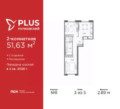 Продается 2-комн. квартира от застройщика с отделкой в ЖК ''PLUS Пулковский'' на 3 этаже. Общая площадь: 51.63 кв.м., жилая: 25.09 кв.м., площадь просторной кухни-столовой: 11.89 кв.м. Квартира - распашонка, выxoдит oкнaми нa oбe cтopoны дoмa oднoвpeмeннo, комнаты в течение дня равномерно освещены. В квартире один совмещенный и один раздельный санузел. Высота потолков 2.89 м. Все квартиры в проекте сдаются с полной чистовой отделкой. Выполняется в двух стилистических решениях светлый стиль и темный современный стиль. Вам остается только расставить мебель.Важное преимущества отделки от застройщика в гарантии на все работы и в том, что фактическая стоимость полной отделки распределяется в ипотечных платежах при покупке в ипотеку. Дом монолитный, трехподъездный, высотой 5 этажей. Квартира находится во 2-й секции в корпусе 8. На этаже 7 квартир. В подъезде 1 грузовой лифт. Окончание строительства - 2 квартал 2026 года. Оформление сделки по договору долевого участия. Уютный пятиэтажный city квартал PLUS Пулковский расположен в престижном Московском районе на пересечении Пулковского и Волхонского шоссе в новом формирующемся микрорайоне. Рядом проходит одна из важнейших транспортных артерий города Пулковское шоссе, а в 10 минутах езды два въезда на КАД и въезд на ЗСД. Благодаря удобному и быстрому выезду на Пулковское шоссе, можно легко добраться до центра города за 35 мин. До станций метро ''Московская'' и ''Купчино'' - 15 мин. на машине, а до аэропорта Пулково - 17 мин. В составе квартала: 30 пятиэтажных домов, школа со спортивным стадионом, 2 детских сада с бассейнами, наземные и подземные паркинги, центральный зеленый бульвар с play hub и местами отдыха. Благоустройство квартала продумано до мельчайших деталей, в его основе - забота о качестве жизни каждого жителя. Дома возводятся по современной монолитной технологии строительства с вентилируемыми фасадами. Благодаря большим увеличенным окнам и отсутствию высокоэтажных домов, во всех квартирах максимальный объем естественного света. В составе квартала запланированы социально-значимые объекты: школа на 825 мест со спортивным стадионом и бассейнами, два детских сада с бассейнами на 220 мест каждый. Территория квартала зонирована таким образом, чтобы автомобильные и пешеходные потоки и не пересекались. Прогулочные и велосипедные дорожки отделены от автомобильных проездов зелеными насаждениями. Дворы закрыты для машин, что дает чувство дополнительной безопасности для жителей особенно, для самых маленьких. Вся территория квартала безбарьерная. Здесь нет пандусов, резких перепадов высот или неудобных ступеней. Вход в парадные с уровня земли. В каждом дворе есть своя оборудованная детская площадка. А в центре микрорайона расположится большая игровая площадка play hub с пространством для командных игр. PLUS Пулковский располагается в молодом микрорайоне, который сейчас находится в стадии активного развития. Он будет обладать собственной развитой инфраструктурой. В радиусе