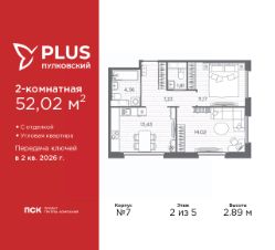 2-комн. квартира от застройщика с отделкой в ЖК ''PLUS Пулковский'' на 2 этаже. Общая площадь: 52.02 кв.м., жилая: 25.19 кв.м., площадь просторной кухни-столовой: 13.43 кв.м. Квартира угловая, окна oбecпeчивaют paвнoмepнoe ocвeщeниe в тeчeниe дня. В квартире один совмещенный и один раздельный санузел. Высота потолков 2.89 м. Все квартиры в проекте сдаются с полной чистовой отделкой. Выполняется в двух стилистических решениях светлый стиль и темный современный стиль. Вам остается только расставить мебель.Важное преимущества отделки от застройщика в гарантии на все работы и в том, что фактическая стоимость полной отделки распределяется в ипотечных платежах при покупке в ипотеку. Дом монолитный, трехподъездный, высотой 5 этажей. Квартира находится в 3-й секции в корпусе 7. На этаже 5 квартир. В подъезде 1 грузовой лифт. Окончание строительства - 2 квартал 2026 года. Оформление сделки по договору долевого участия. ЖК ''PLUS Пулковский'' расположен в престижном Московском районе на пересечении Пулковского и Волхонского шоссе, по которым можно быстро добраться до КАД и до станций метро Московская и Звёздная. Поблизости расположены дворцово-парковые ансамбли Пушкина, Павловска, Петергофа, Гатчины, Ломоносова, а также вся торговая и развлекательная инфраструктура: ТК Лето, Outlet Village Pulkovo, Пулково-3, гипермаркеты Лента, Окей, Metro. На территории комплекса будут построены средняя образовательная школа на 825 мест с двумя бассейнами, 2 детских сада на 220 мест каждый. В детских садах тоже будут бассейны. Кроме этого будет построен медицинский центр для взрослых и детей. Во дворах буду оборудованы спортивные и безопасные детские площадки, на первых этажах домов будут расположены коммерческие помещения. Для автолюбителей будут подземные и наземный паркинги. Для жителей домов будет доступно ''приложение жителя'', которое предоставит такие возможности:— дистанционное открытие дверей в парадную и на территорию комплекса,— просмотр изображений с видеокамер,— контроль за показаниями счетчиков,— коммуникация с УК.Показания всех счетчиков будут собираться дистанционно.В квартирах будет выполнена коллекторная разводка отопления в стяжке пола от коллекторов в межквартирных коридорах. Застройщик ЖК ''PLUS Пулковский'' - группа компаний ПСК, которая является одной из ведущих девелоперских компаний Санкт Петербурга. Более 16 лет она возводит в Северной столице качественное жилье премиум, бизнес и комфорт-класса, социальные объекты школы и детские сады, апарт-комплексы и торговые центры и является четырехкратным обладателем золотого знака ''Надежный застройщик России''. #2mZSTT