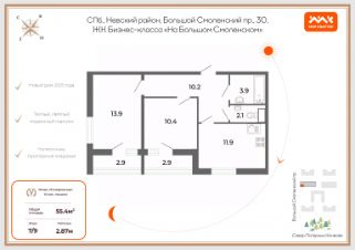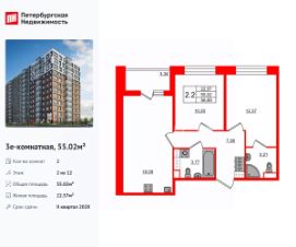 Цена со скидкой до 30% в прямой продаже от застройщика — только в этом месяце. При покупке апартаментов - паркинг за полцены. На все апартаменты действует беспроцентная рассрочка. Купите на распродаже! Покупка недвижимости в Zoom на Неве сейчас со скидкой до 30% позволит через 2 года получить доход до 6 300 000 руб. Роскошные виды на Неву. 2-к апартамент в комплексе класса бизнес-лайт Zoom на Неве на 2-м этаже. Общая площадь 54,78. Без отделки.Zoom на Неве расположен в новом месте силы рядом с центром города на первой линии Октябрьской набережной в Невском районе, всего в 7 км от исторической части Санкт-Петербурга. Большой выбор эргономичных и максимально продуманных планировок позволит каждому найти вариант по душе. Панорамные виды на Неву, благоустроенные дворы, детская игровая комната, подземный паркинг, коммерческие зоны на первом этаже, это и многое другое делает Zoom на Неве идеальным местом для жизни. Особенности:- Панорамные виды на Неву и город,- 10 мин. до Парка Строителей, 15 мин. до Лондон-молла, Ленты, Максидома, 15 мин. до метро ''ул. Дыбенко'', 12 мин. до КАД, 10 мин. до центра,- Единая архитектурная концепция. Сдержанные и монументальные фасады в неоклассическом стиле,- Парадный лобби для жильцов. Единый вход в комплекс с администратором, зоной ресепшн и охраной, зоной для бесконтактной доставки посылок и еды,- Подземный отапливаемый паркинг с доступом из парадной,- Доступно 3 варианта отделки на выбор: черновая, предчистовая (White Box) и чистовая,- Зоны отдыха для взрослых и детей, Wi-Fi-покрытие во дворе и в паркинге, зоны для питомцев, арт-объекты и много другое. В шаговой доступности вся необходимая инфраструктура от детских садов и школ до супермаркетов и салонов красоты,- Все происходящее контролируется видеокамерами, а покой внутренней территории и безопасность ваших детей гарантируется полным отсутствием транспорта во дворах в концепции ''без машин''.