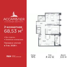 Просторная двухкомнатная квартира в Клубный квартал ''Ассамблея'' на 9 этаже. Квартира без отделки, после оформления собственности можно делать ремонт. Общая площадь: 68.75 кв.м., жилая: 26.79 кв.м., площадь просторной кухни-столовой: 17.06 кв.м. Квартира - распашонка, без проходных комнат, окна выходят на paзные стороны дома. В квартире один балкон, один совмещенный и один раздельный санузел. Высота потолков 3.0 м. Дом монолитный, черырехподъездный, высотой 12 этажей. Квартира находится в 4-й секции в корпусе 5. На этаже 10 квартир. В подъезде 1 пассажирский и 1 грузовой лифт. Окончание строительства - 3 квартал 2028 года. Оформление сделки по договору долевого участия. В шаговой доступности от жилого комплекса находятся станции метро (расстояние по прямой): ''Горный институт'' (1.0 км), ''Василеостровская'' (1.4 км), ''Приморская'' (1.5 км), также недалеко от этого корпуса находятся станции метро: ''Спортивная'', ''Чкаловская''. ''Клубный квартал Ассамблея'' — проект бизнес-класса на Васильевском острове, в самом сердце исторического Петербурга. Комплекс состоит из пяти корпусов переменной этажности — от 7 до 12 этажей — с выразительной архитектурой в стиле неомодернизма: светлый клинкер, панорамное остекление, просторное лобби с потолками высотой почти 8 метров. Потолки — до 3,2 метров. Подземный паркинг на 667 машиномест. Комфорт и инфраструктура Проект ориентирован на комфортную городскую жизнь. В закрытом дворе — ландшафтное озеленение, современные детские и спортивные площадки. Внутренний клуб для резидентов включает коворкинг, переговорные, кинозал, фитнес и бьюти-зону. IP-домофония с просмотром камер видеонаблюдения, дистанционное открывание дверей и доступа на территорию и в парадную со смартфона и планшета, просмотр показаний счетчиков, приложение для жителей PSK Home. Локация Расположение на Васильевском острове — сильная сторона проекта. До четырех станций метро (''Горный институт'', ''Василеостровская'', ''Спортивная'', ''Приморская'') — 515 минут пешком. В шаговой доступности — зелёные зоны, культурные учреждения, в том числе сад ''Василеостровец'' и ДК имени Кирова. Основные магистрали Большой, Средний и Малый проспекты, Наличная и Уральская улицы. Съезд на ЗСД расположен недалеко от станции метро ''Приморская'', близ береговой линии. Благовещенский и Дворцовый мосты соединяют остров с центром города, а мосты Тучков, Биржевой и Бетанкура — с Петроградской стороной. Застройщик Группа компаний ПСК является одной из ведущих девелоперских компаний Санкт Петербурга. На протяжении 18 лет она возводит в Северной столице качественное жилье премиум, бизнес и комфорт-класса, социальные объекты школы и детские сады, апарт-отели и торговые центры. Является шестикратным обладателем золотого знака ''Надежный застройщик России''. #ZMZAu3