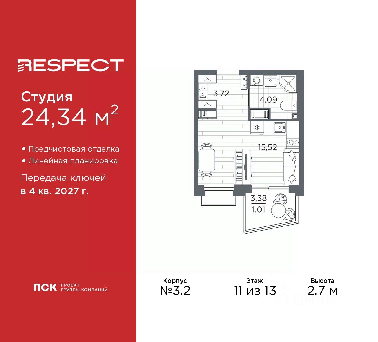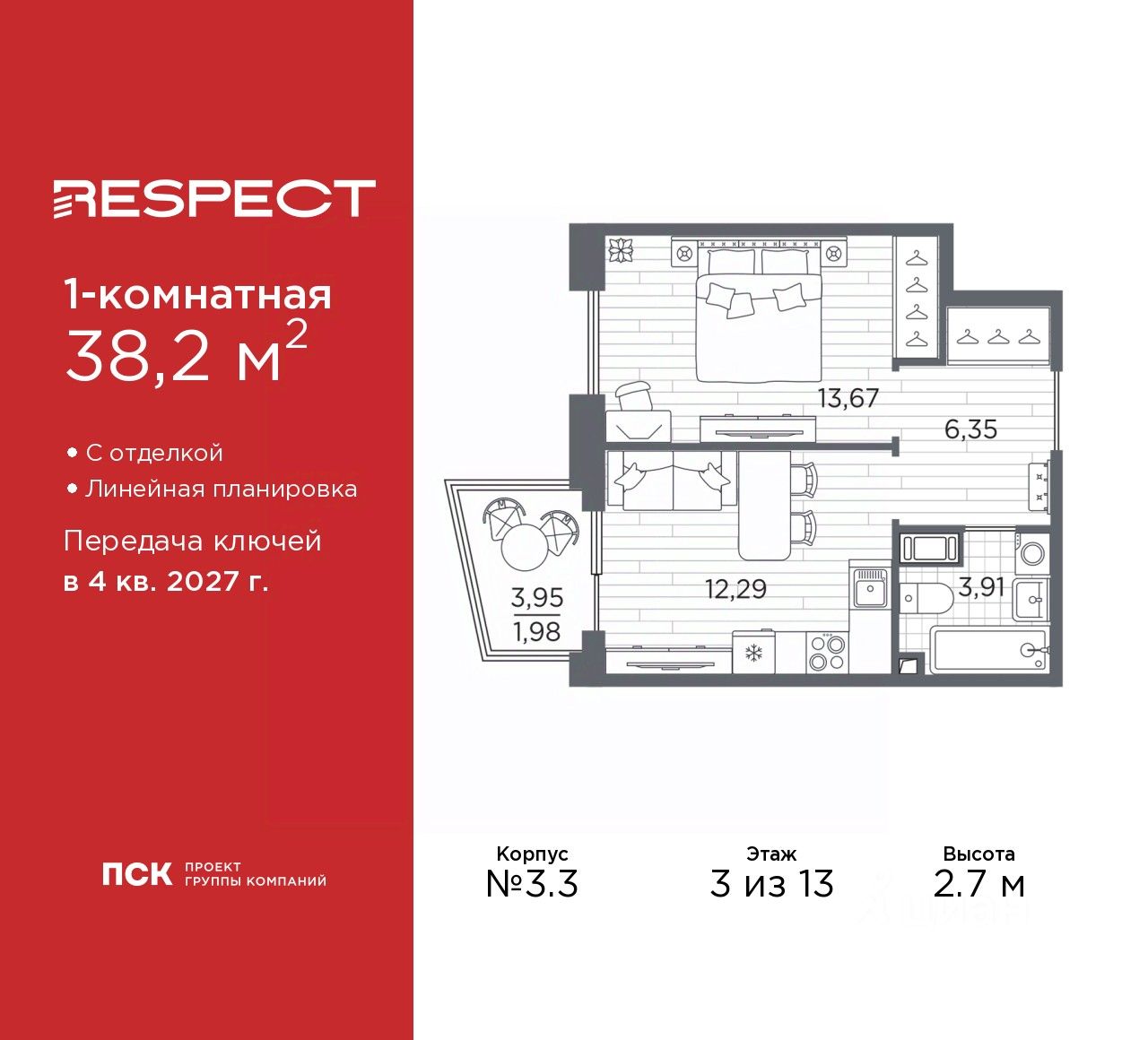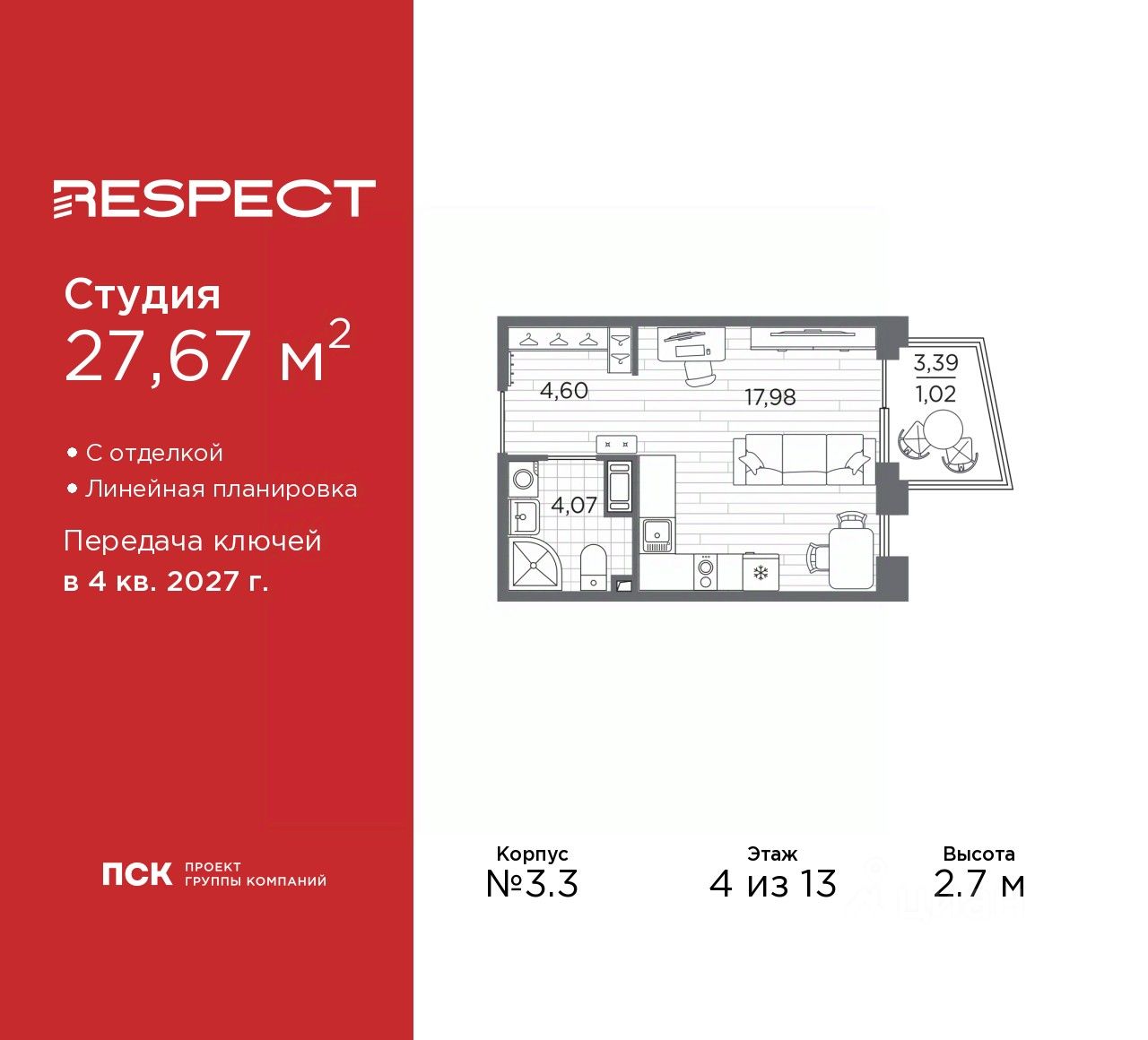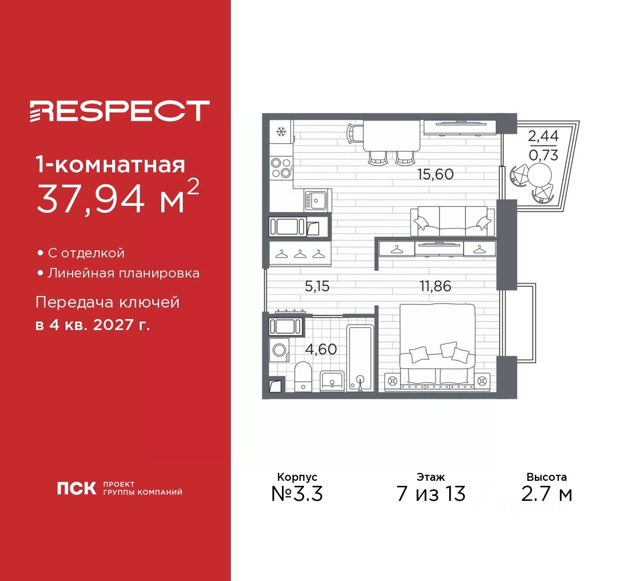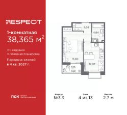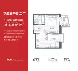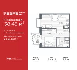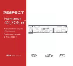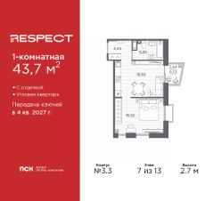 Просторная 1-комн. квартира с отделкой в ЖК ''RESPECT'' на 7 этаже. Общая площадь: 43.7 кв.м., жилая: 16.52 кв.м., площадь просторной кухни-столовой: 16.65 кв.м. Квартира угловая, очень светлая, естественная вентиляция при открытии окон. В квартире один балкон, один совмещенный санузел. Высота потолков 2.7 м. Дом монолитный, многоподъездный, переменной этажности, от 8 до 13 этажей. Квартира находится в 1-й секции высотой 13 этажей в корпусе 3.3. На этаже 6 квартир. В подъезде 1 пассажирский и 1 грузовой лифт. Начало строительства - 3 квартал 2025 года. Окончание строительства - 4 квартал 2027 года. Оформление сделки по договору долевого участия. В шаговой доступности от жилого комплекса расположены станции метро (расстояние по прямой): ''Лесная'' (800 м), ''Площадь Мужества'' (1.4 км), ''Выборгская'' (1.9 км), также недалеко от этого корпуса находятся станции метро: ''Академическая'', ''Политехническая''. Жилой квартал ''RESPECT'' строится на Полюстровском пр, 87, в одной из самых востребованных локаций Петербурга. В 10 минутах пешком - метро ''Лесная'' и в 10 минутах на транспорте - Петроградская сторона. Высота домов от 7 до 13 этажей. Квартиры сдаются с отделкой white box и с чистовой отделкой. На территории Respect строится школа на 1125 учащихся и детский сад на 240 мест. Запроектированы собственная газовая котельная, закрытая территория, дворы без машин и подземные паркинги с лифтами.В проекте предусмотрены трапециевидные балконы или остекленные лоджии, которые, с одной стороны, исключают монотонность фасада, являясь декоративными элементами, с другой дополнительным функциональным пространством в квартирах. Цветовая гармония фасадов каждого дома раскрывает характер квартала. Коричневый цвет клинкерного кирпича со структурой водяных штрихов — цвет уюта и безопасности, сдержанности и надёжности. Вентилируемые фасады облицованы клинкерным кирпичом. Его высокая прочность позволяет давать 100 лет гарантии на этот материал. Водопоглощение клинкерного кирпича составляет менее 5%, за счет чего у него высокая теплопроводность и прочность. В квартале запроектированы внутренние закрытые территории дворов домов без доступа автомобилей и безбарьерная среда для велосипедистов и колясок. Предусмотрены IP-домофония с функцией дистанционного открывания калиток и парадных, а также дистанционный сбор показаний счетчиков и мобильное приложение для жителей. Для безопасности жителей квартала - круглосуточное видеонаблюдение и служба охраны. В каждой квартире предусмотрены внешние корзины для кондиционеров. Вся территория квартала будет связана единой концепцией благоустройства, разработанной ландшафтным бюро L.BURO. На эксплуатируемой кровле на уровне первого этажа в домах 1 и 4 будут обустроены общественные видовые террасы. Это станет не только привлекательным местом с красивым видом, но и удобным, многофункциональным пространством. Дизайн парадных зон и входных групп - сочетание лаконичности отделки и декоративных элементов с текстурами из натуральног