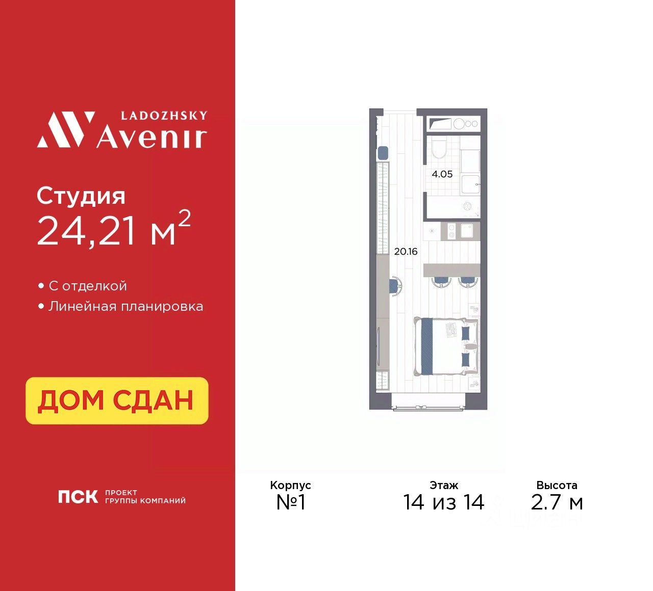 1-комн. апартаменты-студия с отделкой в ЖК ''Ladozhsky AVENIR'' на 14 этаже. Общая площадь: 24.28 кв.м., площадь гостиной 20.23 кв.м., из которых 5 кв.м. выделено под кухонную зону. Все окна выходят на одну сторону. В апартаментах один совмещенный санузел. Высота потолков 2.7 м. Апартаменты находятся в корпусе 1. Дом монолитный, одноподъездный, высотой 14 этажей. На этаже 50 квартир. В подъезде 4 пассажирских и 4 грузовых лифта. В шаговой доступности от дома находятся станции метро (расстояние по прямой): ''Ладожская'' (800 м), ''Новочеркасская'' (1.7 км), также недалеко от этого корпуса расположены станции метро: ''Площадь Александра Невского'', ''Чернышевская'', ''Площадь Восстания''. Тест-драйв в готовых апартаментах. Перед покупкой можно арендовать номер для проживания с компенсацией от застройщика. Ladozhsky AVENIR — апартотель бизнескласса в историческом районе Матросская слобода на Правобережье Невы в 10 минутах пешком от станции метро ''Ладожская'' и 10 минутах на автомобиле до Невского проспекта. Апартотель Ladozhsky AVENIR — четвертый проект сети сервисных апартотелей AVENIR и первый мультиформатный проект, включающий в себя апартаменты, офисы и коммерческие помещения. Относится к высокому сегменту ''Бизнес - класс'' Все апартаменты сдаются с отделкой ''под ключ'' в единой стилистике. Семейная ипотека на апартаменты не распространяется. Деятельность по сдаче апартаментов в аренду осуществляет управляющая компания PSK INVEST, входящая в группу компаний ''ПСК''. Для передачи апартамента в управление PSK IINVEST необходимо заключить договор на приобретение пакета ''Меблировка и оснащение''. Аккредитация в банках: ''Сбербанк России'', ПАО Банк ''ВТБ'', ПАО ''Банк Уралсиб'', ПАО ''Совкомбанк'', ПАО Банк ''ФК Открытие'' и других. #25Vg3S