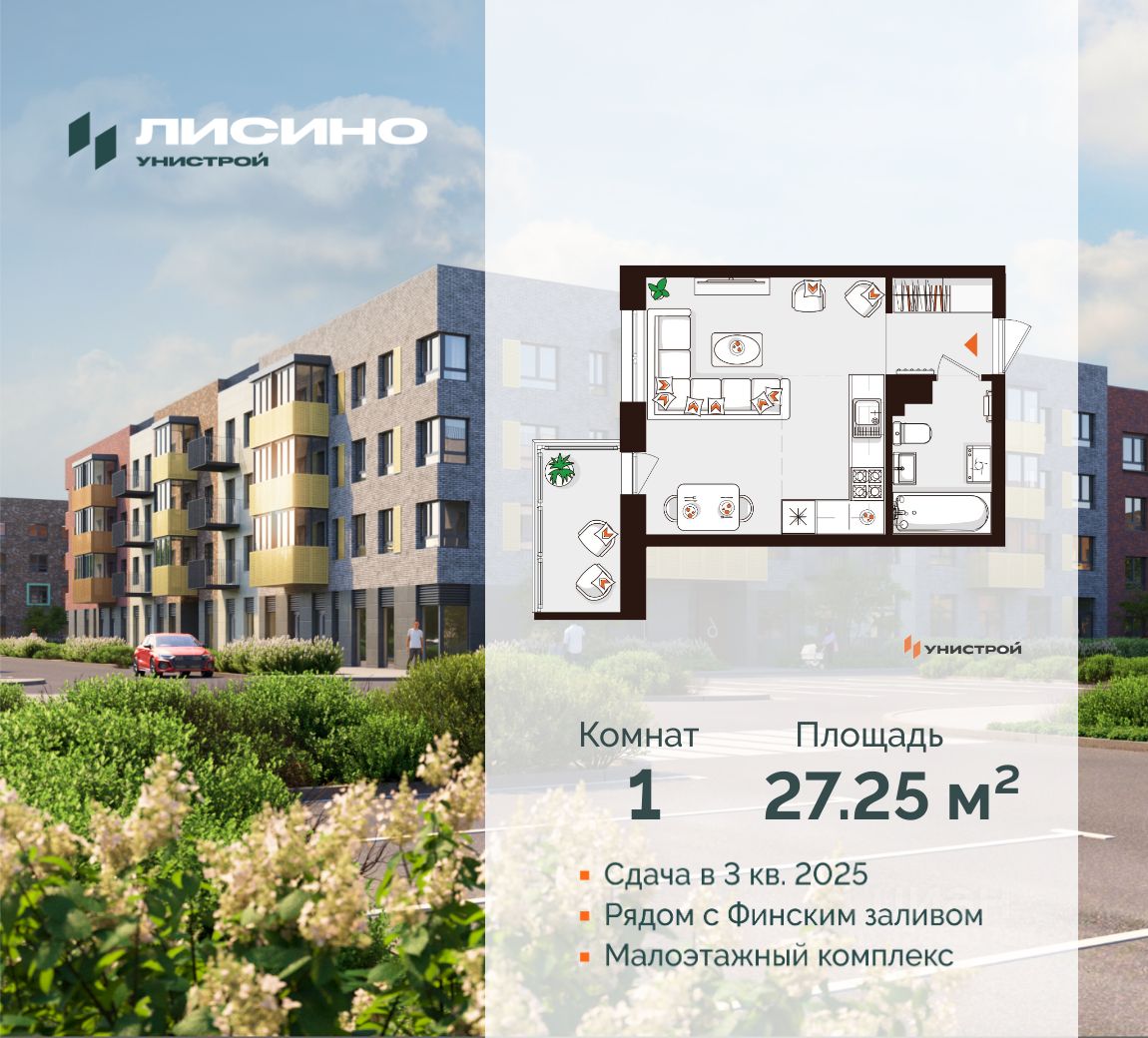 Лисино ''Лисино'' город-парк в Курортном районе Санкт-Петербурга от компании ''Унистрой''. Рядом Финский залив, экопарк, озеро, а также самый высокий небоскреб в Европе. Комплекс отличает чистый воздух, малоэтажная застройка, фасады из клинкерной плитки, уютные дворы, прогулочный бульвар, парковые зоны. Представлено разнообразие планировок: от студий, до двухуровневых квартир. Живите там, где другие отдыхают Город-парк ''Лисино'' находится в Курортном районе Санкт-Петербурга, в 15 минутах езды по Приморскому шоссе от станции метро ''Беговая''. Рядом Финский залив с благоустроенным пляжем, экопарк, озеро Сестрорецкий разлив и ''Лахта Центр''. Локация славится морским воздухом и хвойными лесами. Вблизи расположены Сестрорецкие болота, известные минеральной водой и лечебными грязями. Живите там, где комфортная застройка Комплекс состоит из малоэтажных домов квартальной застройки, создающих приватные дворы без машин. Высота в 4 этажа обеспечивает уют и простор. Урбан-виллы с террасами отделены приватными садами и прогулочными зонами. Фасады из клинкерной плитки натуральных оттенков подчеркивают природное окружение. Дома расположены таким образом, чтобы из квартир открывались виды на лесопарк или сад. Живите там, где много парков Территория выполнена в виде сенсорных садов, отражающих времена года с соответствующей растительностью. В центре расположен парк с различными зонами: центральная площадь, пруд с набережной, игровые площадки для детей, йога-парки, экотропа, спортивный хаб, скейтпарк, памптрек, велодорожки. Живите там, где стильно Двор и входы в парадные без пандусов и ступеней. Входные группы и холлы оформлены в натуральных оттенках по авторскому дизайн-проекту, и включают домофоны в тёплых тамбурах, бесшумные лифты и колясочные. Жилые этажи выдержаны в едином стиле. На цокольных этажах есть индивидуальные кладовые. Живите там, где красивые виды В ''Лисино'' представлены разнообразные планировочные решения: студии, евроформаты, квартиры с саунами, мастер-спальнями, угловыми окнами, постирочными. На первых этажах расположены квартиры с террасами. Доступны двухуровневые квартиры и урбан-виллы, а также квартиры с тёплыми лоджиями. Живите там, где высокий сервис В квартирах предусмотрена предчистовая отделка с качественными материалами: металлические входные двери со smart-замками, улучшенная теплоизоляция, окна с энергоэффективными стеклопакетами, стяжка пола, скрытая разводка коммуникаций, радиаторы с терморегуляцией. Входы в парадные оснащены домофонами с бесконтактным доступом и распознаванием лиц. Питьевая вода будет подаваться в каждую квартиру. Автоматизирован учет потребления ресурсов. Живите там, где всё рядом В ''Лисино'' будут 2 школы и 4 детских сада, а также поликлиника, многофункциональный центр, физкультурно-оздоровительный комплекс и культурный центр. На первых этажах откроются коммерческие помещения. Комплекс будет оснащен многоуровневым паркингом, автостоянкой, станциями для заряда электромобилей, велопарковками и местами для выгула живот