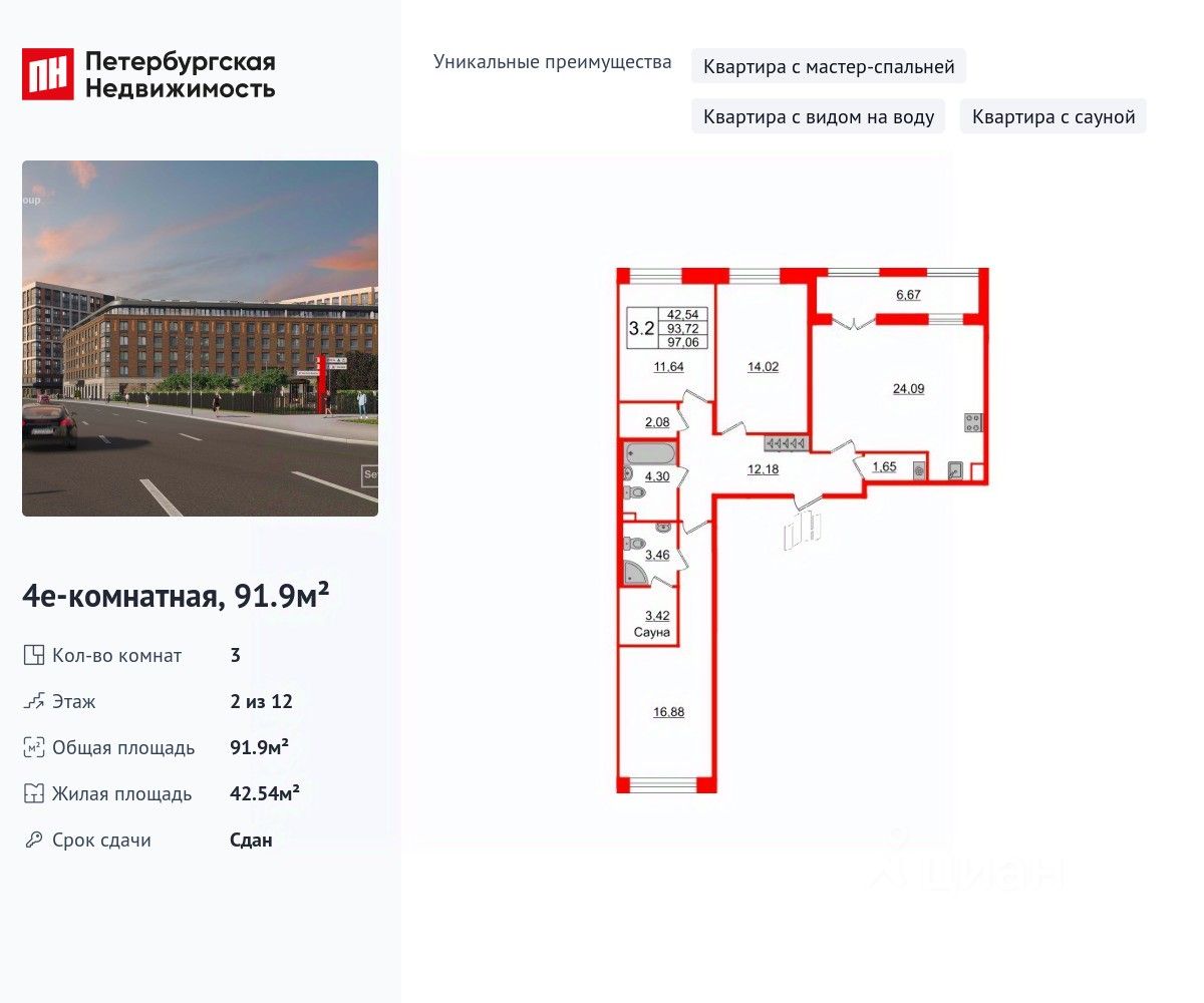 Продается уютная, семейная 3-комнатная квартира в жилом комплексе ''Amber Club'' в уютном Василеостровском районе. До метро можно добраться пешком всего за 15 минут. Мастер-спальня с собственной ванной комнатой. Самое приватное пространство в вашей квартире. Сауна в ванной комнате. Расслабьтесь и восстановите силы, как в СПА-салоне. Вид на воду станет главным украшением квартиры, создаст в ней гармоничную и спокойную атмосферу. Уникальная, функциональная европланировка, большая кухня-гостиная 24.09 м², просторная прихожая 12.18 м². Общая площадь квартиры - 91.9 м², жилая 42.54 м², высота потолка 2.76 м. Квартира продается с отделкой ''Норд Лайн серый комфорт''. Что особенного в ЖК ''Amber Club''? • Уникальные квартиры пентхаусы, квартиры с террасами и каминами • Премиальные виды на Малую Неву и Петровский остров • Шаговая доступность до метро (15 мин. Пешком), удобный выезд на ЗСД прямо с набережной • Amber-сквер с relax-зонами в экостиле и прогулочной аллеей • Единые входные группы со вторым светом, reception и лаунж-зонами