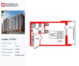 Продается уютная студия от застройщика в жилом комплексе ''Титул в Московском'' в престижном Московском районе.До метро можно добраться пешком всего за 25 минут.Удобная, классическая, функциональная европланировка, вместительная прихожая 3.03 м². Общая площадь студии - 21.05 м², жилая 15.02 м², высота потолка 2.77 м.Квартира продается с отделкой ''NORD LINE WHITE ВК NEW''.Что особенного в ЖК ''Титул в Московском''?• Престижный Московский район• Авторская архитектурная концепция• 2 центральные входные группы с ресепшн и лаундж-зонами• Кленовая аллея с арт-стеллой, цветочная аллея и сад трав• Уютные дворы-патио, площадки SetlKids и SetlSport• Инновационный Лицей Setl с оригинальной архитектурной концепцией и уникальной образовательной средой