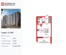 Продается уютная студия от застройщика в жилом комплексе ''Титул в Московском'' в престижном Московском районе.До метро можно добраться пешком всего за 25 минут.Удобная, классическая, функциональная европланировка, вместительная прихожая 3.01 м². Общая площадь студии - 21.28 м², жилая 15.13 м², высота потолка 2.77 м.Квартира продается с отделкой ''NORD LINE SILVER ВК NEW''.Что особенного в ЖК ''Титул в Московском''?• Престижный Московский район• Авторская архитектурная концепция• 2 центральные входные группы с ресепшн и лаундж-зонами• Кленовая аллея с арт-стеллой, цветочная аллея и сад трав• Уютные дворы-патио, площадки SetlKids и SetlSport• Инновационный Лицей Setl с оригинальной архитектурной концепцией и уникальной образовательной средой