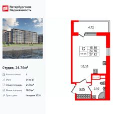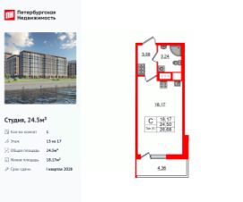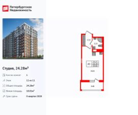 Продается просторная студия от застройщика в жилом комплексе ''Setl Ривьера'' в активно развивающимся Невском районе.До метро можно добраться на транспорте всего за 10 минут.Удобная, классическая, функциональная европланировка, вместительная прихожая 3.06 м². Общая площадь студии - 24.53 м², жилая 18.19 м², высота потолка 2.77 м.Квартира продается с отделкой ''Норд Лайн светлый плюс''.Что особенного в ЖК ''Setl Ривьера''?• Первая береговая линия Невы. 5 км до центра Петербурга• ''Активити парк'' - пространство для занятий спортом и отдыха. ''Ривьера парк'' с променадом и панорамной ротондой• Масштабные дворы 10 000 кв.м. с авторским ландшафтным дизайном• Двухуровневые единые входные группы• Видовые квартиры с террасами, каминами и саунами