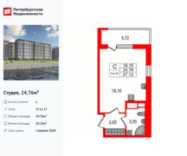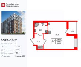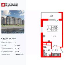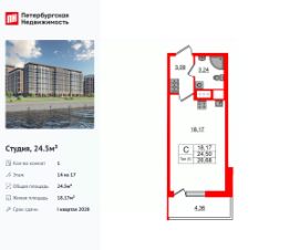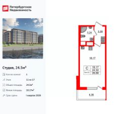 Продается уютная студия от застройщика в жилом комплексе ''Setl Ривьера'' в активно развивающимся Невском районе.До метро можно добраться на транспорте всего за 10 минут.Удобная, классическая, функциональная европланировка, вместительная прихожая 3.09 м². Общая площадь студии - 24.5 м², жилая 18.17 м², высота потолка 2.77 м.Квартира продается с отделкой ''NORD LINE SILVER ВК NEW''.Что особенного в ЖК ''Setl Ривьера''?• Первая береговая линия Невы. 5 км до центра Петербурга• ''Активити парк'' - пространство для занятий спортом и отдыха. ''Ривьера парк'' с променадом и панорамной ротондой• Масштабные дворы 10 000 кв.м. с авторским ландшафтным дизайном• Двухуровневые единые входные группы• Видовые квартиры с террасами, каминами и саунами