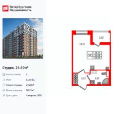 Продается просторная студия от застройщика в жилом комплексе ''Астра Континенталь'' в активно развивающимся Невском районе.До метро можно добраться пешком всего за 5 минут.Удобная, классическая, функциональная европланировка, вместительная прихожая 3.01 м². Общая площадь студии - 24.69 м², жилая 18.11 м², высота потолка 3 м.Квартира продается с отделкой ''Норд Лайн светлый плюс''.Что особенного в ЖК ''Астра Континенталь''?• Уникальная локация 400 метров до метро, 300 метров до благоустроенной набережной• Самодостаточный квартал со всей инфраструктурой в 3-х км от центра• Впечатляющий объем благоустройства: 30 000 кв. метров рекреационных зон с променадом и гейзерными фонтанами• Масштабный парк ''Город Спорта''