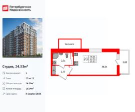 Продается просторная студия от застройщика в жилом комплексе ''Setl Ривьера'' в активно развивающимся Невском районе.До метро можно добраться на транспорте всего за 10 минут.Удобная, классическая, функциональная европланировка, вместительная прихожая 3.06 м². Общая площадь студии - 24.53 м², жилая 18.19 м², высота потолка 2.77 м.Квартира продается с отделкой ''Норд Лайн серый плюс''.Что особенного в ЖК ''Setl Ривьера''?• Первая береговая линия Невы. 5 км до центра Петербурга• ''Активити парк'' - пространство для занятий спортом и отдыха. ''Ривьера парк'' с променадом и панорамной ротондой• Масштабные дворы 10 000 кв.м. с авторским ландшафтным дизайном• Двухуровневые единые входные группы• Видовые квартиры с террасами, каминами и саунами