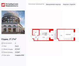Продается просторная студия от застройщика в жилом комплексе ''Аристократ'' в уютном Василеостровском районе.До метро можно добраться пешком всего за 10 минут.Открытая терраса! Завтракайте или занимайтесь спортом на свежем воздухе!В такой квартире вы можете самостоятельно создать второй антресольный уровень или использовать высокие потолки, как эксклюзивное дизайнерское решение.Уникальная, функциональная европланировка, вместительная прихожая 2.63 м². Общая площадь студии - 27.27 м², жилая 13.33 м².Квартира продается c черновой отделкой.Что особенного в ЖК ''Аристократ''?• Васильевский остров - историческая локация с современными культурными кластерами• Индивидуальный облик каждого корпуса в единой архитектурной концепции• 7 парадных лобби с потолками до 7-ми метров• Цветущие сады, зеленые гостиные, фонтаны• Клуб резидентов ''Аристократ'': фитнес-клуб, коворкинг, гостиная с роялем, детский центр с кинотеатром• Технологичная среда на территории, в доме и в квартире• Премиальная отделка квартир - Nord line business