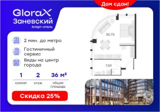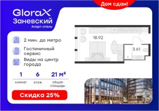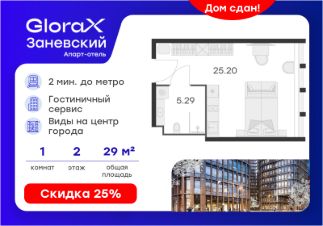 Продается апартамент-студия на 2-м этаже в Апарт-отеле ''GloraX Заневский'' с сервисом 4*. Старт работы отеля - декабрь 2024 г.! Общая площадь лота составляет 45,25 кв. м, из которых 40,43 кв. м отведено под жилую. Номер апартамента - 221.Преимущества:- Апарт-отель с сервисом 4 звезды- Меблировка и техника - 2 вида доходных программ- Консьерж-сервис- Вход по ключ-карте- Прачечная для гостей на 1 этаже- Уборка номеров- Безопасная территория и изолированный внутренний двор - Pet-friendlyАпарт-отель ''GloraX Заневский'' современный отель с развитой инфраструктурой, удовлетворяющей все потребности самых взыскательных гостей. Апарт-отель ''GloraX Заневский'' располагается в одном из наиболее перспективных, районов Петербурга в 2х минутах от метро ''Ладожская'' и Ладожского вокзала, в 10 минутах от Московского вокзала и в 20 минутах от исторического центра.В апарт-отеле ''GloraX Заневский'' есть все, что необходимо для комфортной жизни, работы и отдыха. Инфраструктура, покрывающая все потребности и ожидания собственников и арендаторов. В радиусе 150 метров находятся супермаркеты с возможностью доставки продуктов прямо до дверей апартаментов.На 1000 кв. м. общественных пространств расположится уютный лобби-бар, ресторан мировой кухни на 80 человек, фитнес-зал и оборудованные коворкинги.В апартаментах ''GloraX Заневский'' выполнена современная отделка с использованием высококачественных экологичных материалов. Инновационные технологические системы, аварийные и противопожарные датчики, взаимодействие со службами быстрого реагирования гарантируют резидентам комплексную безопасность. В проекте предусмотрен подземный отапливаемый паркинг на 100 мест, куда можно спуститься на лифте прямо от дверей апартаментов.Вся информация по эксплуатации номера аккумулируется в специально разработанном приложении, не имеющем аналогов на рынке. Функциональное и удобное приложение помогает оперативно решать все возникающие вопросы в режиме реального времени. Благодаря инновационному решению по оперативным выплатам деньги от аренды поступят на ваш счет максимально быстро.Цена указана при 100% оплате или стандартной ипотеке. Узнайте подробности в Отделе продаж.