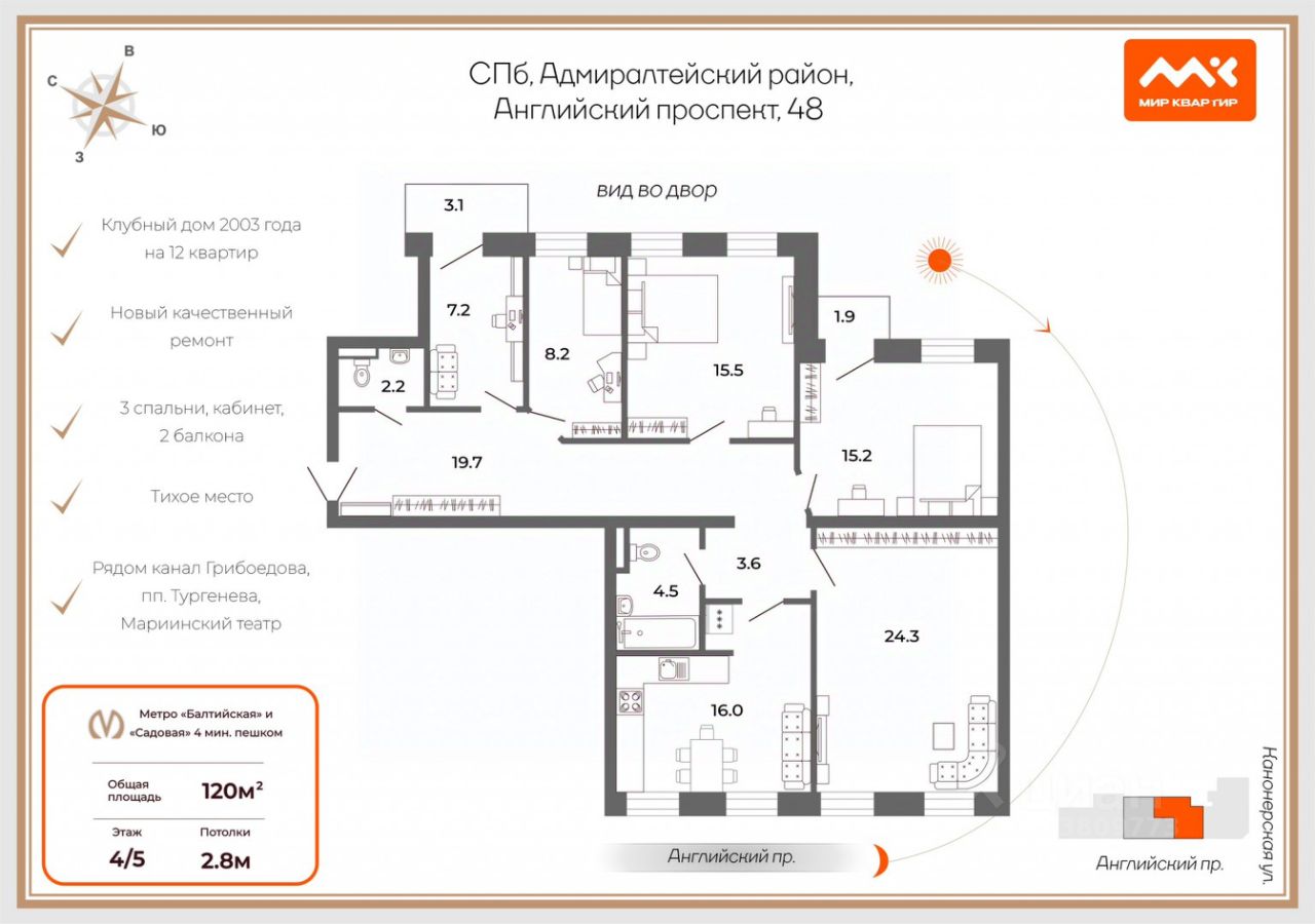 Арт. 125130645 Клубный дом 2003 года в 10 минутах от Мариинского театра.Новый основательный качественный ремонт.3 спальни, кабинет, 2 балкона.Уважаемый покупатель, Вашему вниманию предлагается редкое предложение для ценителей исторического центра Санкт-Петербурга, - 4к квартира в современном клубном доме в Тихой части Адмиралтейского района рядом с каналом Грибоедова и Площадью Тургенева. Кирпичный дом 2003 года постройки,толстые стены, современный лифт, вход из благоустроенного закрытого двора с детской площадкой, видеонаблюдение, аккуратная парадная. В доме всего 12 квартир, однородный состав жильцов. Квартира общей площадью 120м.расположена на 4 этаже из 5, двухсторонняя, грамотно спланирована для комфортного проживания семьи. Планировка включает в себя: уютную кухню-столовую 16м, 3 спальни правильной формы 24.3м., 15.5м и 15.2м., кабинет 8.2м., гардеробная/хозблок 7.2 м, просторный холл 23.3м, предусмотрены многочисленные зоны для хранения, 2 санузла, 2 застекленных балкона. Выполнен новый основательный дизайнерский ремонт с применением качественных экологичных современных материалов и инженерных решений.Проведен высокоскоростной интернет. Планировка согласована. Квартира очень светлая, воздушная. В отделке использованы мягкие пастельные оттенки. Приятный вид, Окна выходят на Английский проспект, мы видим нарядные фасады исторических особняков, и в тихий закрытый двор без машин, что позволяет наслаждаться тишиной.Исторический район с развитой социальной и транспортной инфраструктурой: рядом канал Грибоедова, площадь Тургенева, в пешей доступности старая и новая сцены Мариинского театра, Концертный зал, Никольский Собор, 1,5км до ''Новой Голландии'', престижные школы, гимназии, детские сады, легко добраться в различные районы города, недалеко удобный выезд на ЗСД, 10 минут до центра. В ближайшем будущем планируется открытие станции метро ''Театральная'', в 7 минутах пешком, что, безусловно, повысит ликвидность этого места.В собственности физлица более 5 лет. Приглашаем Вас на просмотр!Предлагаем ПРЕМИАЛЬНОЕ обслуживание для требовательных клиентов.Оперативно организуем просмотр, предоставим полную информацию по объекту.20 лет работы с требовательными клиентами подготовили нас к решению ВАШИХ сложных задач.Будем рады знакомству! Ул. Рубинштейна, д.8.