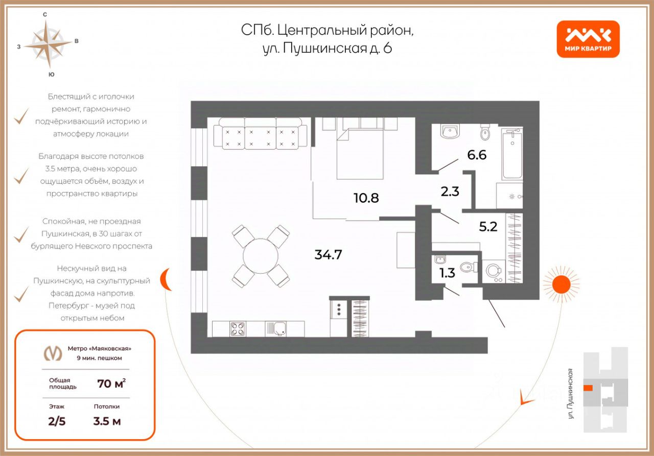 Арт. 117250977 Эксклюзивная квартира в элегантном и лёгком стиле на красивой тихой улочке, примыкающей к Невскому проспекту. Дамы и господа, счастливы представить Вам квартиру для искушённой пары или же ''утомлённого богача''. Да, здесь всего одна спальня, но находясь в квартире, не возникает ощущения, что пространство использовано ''нерационально''.. Этот воздух, эта свобода, эта высота потолков создают совершенно неповторимую благородную атмосферу, подчёркнутую непререкаемым качеством исполнения интерьера. Вкупе с восстановленной кирпичной кладкой, огромными окнами, за которыми на соседнем фасаде возвышаются античные атланты, вкупе c бережно отреставрированным старинным шкафом (реликвией семьи, владеющей этой квартирой без малого 90 лет), пространство обретает душу, историю, индивидуальность, характер. Тот самый характер, который ставит наш город на недосягаемый пьедестал. Вход в парадную - с тихой, зелёной Пушкинской улицы. Удобный лестничный марш приведёт Вас на высокий барский второй этаж, на котором и расположилась эта квартира. Техника, освещение и мебель, выбранная и созданная людьми для людей, подарят Вам полноценный отдых и освободят от рутинных, набивших оскомину действий. В этой квартире Вам захочется приготовить завтрак для любимой, сварить кофе в старой медной турке или с удовольствием растянуться на низеньком мягком диване. Да, это квартира! И отличная квартира. Но эта квартира не оставляет равнодушным. Это не квадратные метры, это эмоция, это праздник, который будет всегда с тобой. А для людей рациональных, привыкших к конкретике, это - эталонная ''пиджачная квартира'' - идеальный вариант для тех, кому нужен минимум по максимуму. Дождливая осень. Каноническая Петербургская погода. А ведь есть люди, находящие в этом дожде и пронизывающем ветре наслаждение! Нонсенс. Мягко ткнувшись, Сапсан останавливается у платформы Московского вокзала. Вы ступаете на эту загадочную, неприветливую, но чертовски притягательную землю северной столицы. Такси или пешком? Конечно, такси, ведь такой дождь.. Но почему-то действуете нерационально и делаете шаг из-под козырька вокзала в направлении пешеходного перехода. До Вашей петербургской квартиры тут 5 минут пешком, но за это время Вы промокаете насквозь.. Захлопнув за собой входную дверь, Вы ругаете себя за это ребячество. Но открыв кран с горячей водой в ванной и добавив в чай ложку коньяку, вы сбрасываете остатки намокшей одежды, заворачиваетесь в махровый халат. Достаёте полученную в подарок год назад пластинку, ставите её в проигрыватель рядом с уютнейшим глубоким диваном. Музыка наполняет эту роскошную гостиную и Вас в ней. Взгляд Ваш скользит от Модильяни к этому старинному шкафу, в стёклах которого отразились уже зажёгшиеся уличные фонари и капли дождя в их свете. Вы подходите к одному из этих огромных высоких окон. Смотрите на эту невероятную архитектуру, на это уже иссиня-чёрное небо, слышите эту прекрасную музыку, чуть подпевая ..Old dream maker, you, heart breaker, wherever you're