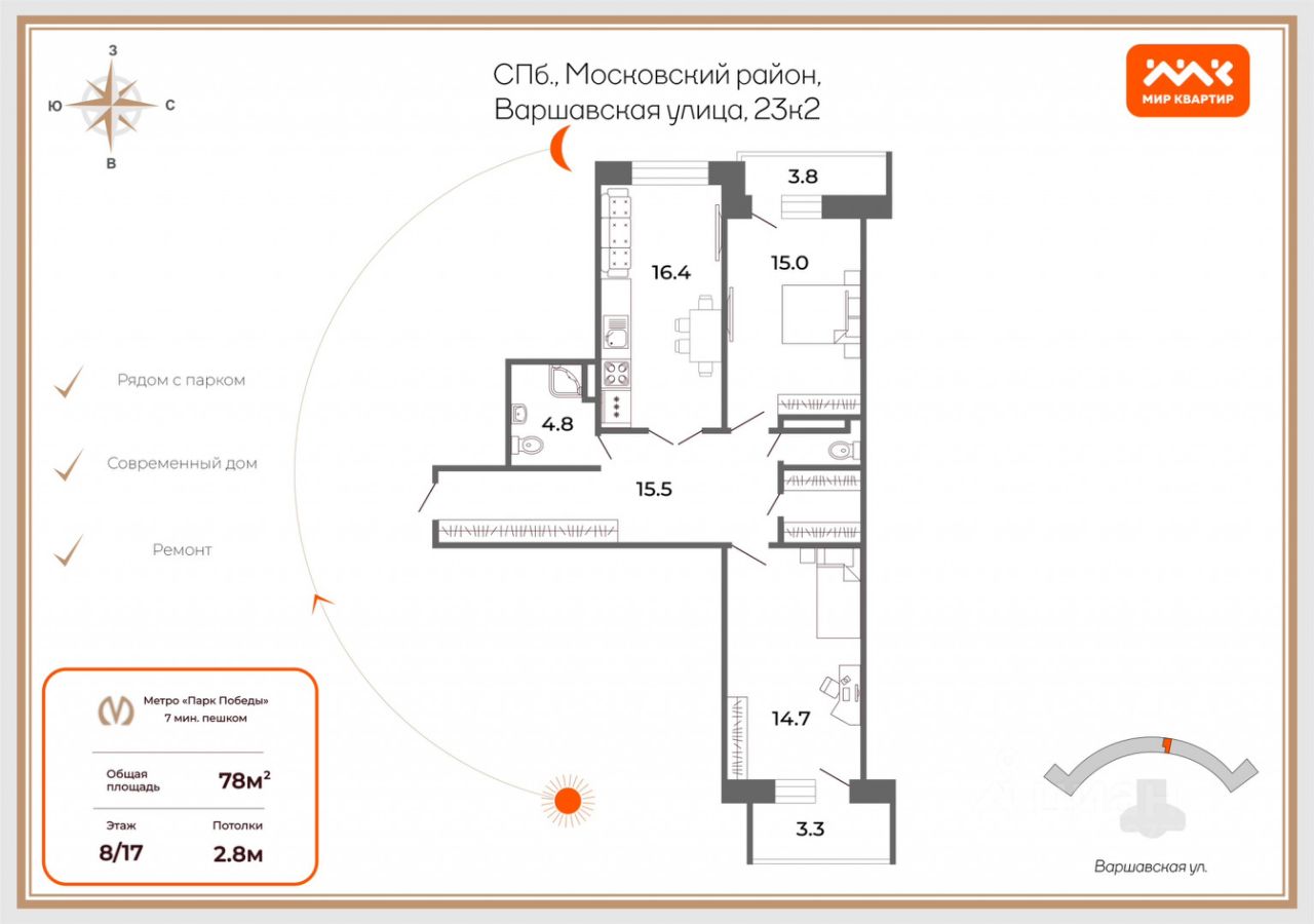 Арт. 105060778 Ваш новый дом в сердце Московского района! Предлагаем вам уникальную возможность стать владельцем светлой и просторной двухсторонней квартиры в современном монолитно-кирпичном доме с архитектурной изюминкой, расположенном в непосредственной близости от метро Фрунзенская. Элегантный дом с характером: Этот кирпично-монолитный дом, построенный по индивидуальному проекту выдающейся архитектурной мастерской Е. Ф. Шаповаловой, впечатляет своей архитектурой. Элементы сталинского ампира, такие как изысканные карнизы, балконы с балясинами и колоннада на вершине, делают его настоящим шедевром. Витражное остекление верхних этажей и панорамные эркеры добавляют особое очарование. Комфорт и безопасность: Квартира имеет отличную планировку и расположена на закрытой охраняемой территории с консьержем и удобным паркингом. Вам будет доступен балкон с живописным видом на Московский проспект, где вы сможете наслаждаться утренним кофе и вечерними закатами. Удобства внутри квартиры: Внутри вас ждёт просторная гардеробная, два современных санузла — с ванной и душевой кабиной, что обеспечит вам максимальный комфорт. Зеленый двор и детская площадка: На закрытой территории двора вас порадует яблоневый сад и детская площадка, где ваши дети смогут безопасно играть, а вы — наслаждаться свежим воздухом и спокойствием. Идеальная транспортная доступность: Всего в шаговой доступности находится метро, что делает вашу жизнь максимально удобной. Для автовладельцев предусмотрен удобный выезд со двора на Московский проспект и Смоленскую улицу. Современные удобства и дружелюбное соседство: Дом оборудован собственной современной автономной котельной, что обеспечивает комфорт в любое время года. Здесь всего 116 квартир, просторные холлы и современные лифты. Управление осуществляется ТСЖ, а соседи — солидные и дружелюбные. Ключевые преимущества: Свободная продажа, один собственник. Построен как элитный дом повышенной комфортности.Уникальная транспортная локация. Продажа по цене за метр новостроек в бетоне! Не упустите шанс стать владельцем этой замечательной квартиры! Звоните прямо сейчас, и ваш новый дом может стать реальностью!