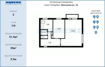 ID: 1915184Прямая продажа 2- х комнатной квартиры на улице Шелгунова 35, Санкт-ПетербургОписание объекта:Предлагается уютная 2-х комнатная квартира, расположенная на 7 этаже 9-этажного кирпичного дома 1966 года постройки. Общая площадь квартиры составляет 51,5 кв. м, при этом жилая —33 кв. м, кухня — 7 кв. м. Высота потолков — 2.5 м, что создаёт ощущение простора и комфорта.Параметры и особенности:• Всё помещение имеет правильную форму, что способствует рациональной планировке.•Окна выходят на улицу Шелгунова и во двор, что обеспечивает хорошее освещение и приятную атмосферу.•На окнах установлены современные стеклопакеты, которые обеспечивают тишину и тепло.•Удобное расположение — квартира находится в тихом районе с развитой инфраструктурой: Поликлиника, Школы и детские сады, что удобно для семей с детьми. Магазины, кафе, рестораны, фитнес-клубы — всё необходимое для комфортной жизни в шаговой доступности. Остановка общественного транспорта, включая автобусы и трамваи. Пешком всего 15 минут до станции метро ''Пролетарская'', что обеспечивает быстрый доступ к центру города.Инфраструктура и комфорт проживания:•Дом оборудован одним лифтом.•Во дворе всегда есть свободное место для парковки автомобиля.•В парадной выполнен хороший ремонт, установлен домофон, есть пандус, мусоропровод.Дополнительные сведения:•Квартира продаётся без обременений, по выгодной цене. 1 собственник. Полная цена в договоре. •Возможна ипотека по сниженной ставке, сопровождение сделки и юридическая поддержка.•Полностью подготовлены все документы для быстрого оформления.Идеально подходит для тех, кто ценит сочетание уютной атмосферы, развитой инфраструктуры и хорошей транспортной доступности.