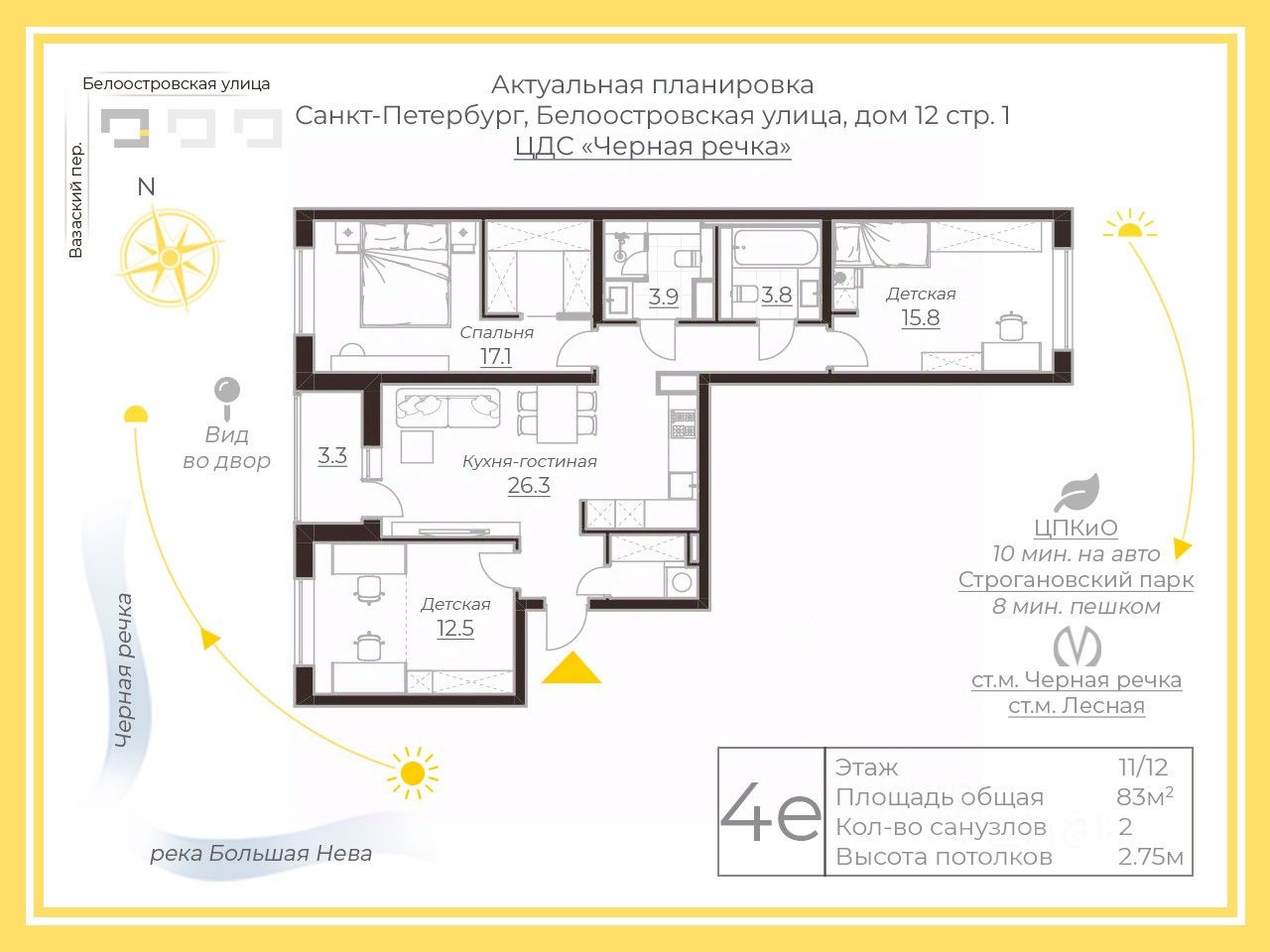 Арт. 117689427 Квартира с тремя спальнями в новом доме бизнес-класса у метро ''Черная речка''. Оптимальное соотношение площади, количества комнат, уровня ремонта и локации! Основные характеристики квартиры: Общая площадь 83 м2 Кухня-гостиная 26,3 м2 Спальня с гардеробной 17,1 м2 Детская комната 15,8 м2 Детская или кабинет 12,5 м2 Два санузла с душевой кабиной и ванной Гардеробная с постирочной 3 м2 Лоджия 3,3 м2 Чтобы не потерять - добавьте в избранное или отправьте тому, кого эта квартира может сделать счастливым! Квартира полностью меблирована и оборудована всей необходимой для современной жизни техникой. В том числе кондиционерами. Высокий этаж с видом на Лахта-центр и перспективу города. Благодаря большим окнам, квартира действительно очень светлая. Квартира расположена в квартале ''ЦДС Черная речка''. Это новый современный микро-район со всей необходимой инфраструктурой в 10 минутах езды от центра города. Ухоженная территория, современные фасады, красивые входные группы. Много коммерции, есть все, что необходимо - от кафешек до супермаркетов, детских развивашек, салонов красоты, зоомагазинов и прочего. Все это в радиусе 5 минут пешком! Дворы закрыты от машин и посторонних людей. В них есть детские площадки, зоны отдыха и спортивные площадки, что важно для семей с детьми. На территории комплекса своя школа и детский сад. Вы точно оцените исключительную транспортную доступность этого квартала! 10 минут пешком до метро ''Черная речка'' и ''Лесная''. 10 минут на машине до Петроградской стороны и выезда на ЗСД. Если вы хотите жить в стильной квартире в новом современном квартале рядом с центром города - звоните и приходите на просмотр квартиры!