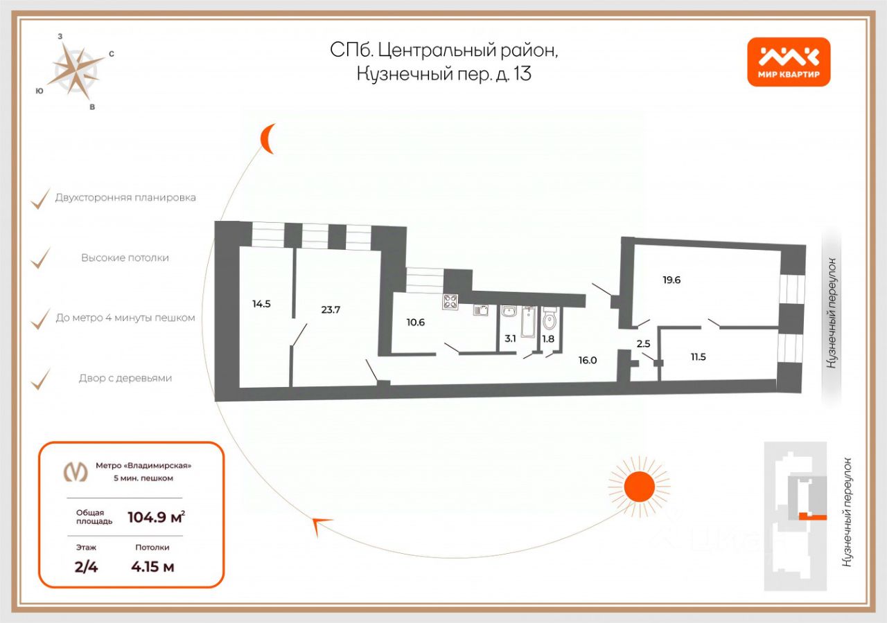 Арт. 112485989 Редкая угловая квартира в доходном доме эпохи модерн — здесь архитектурное наследие органично сочетается с современным комфортом.Квартира отличается продуманной планировкой: три изолированные спальни, большая гостиная с арочными стеклянными перегородками, кухня и столовая с кладовой для хранения продуктов. Выполнен качественный ремонт с использованием премиальных материалов: натуральный паркет, сантехника именитых брендов. Большое количество окон обеспечивает отличное естественное освещение.Доходный дом А. А. Васениной построен в 1910 году архитектором К.Э. Маккензеном в стиле модерн. Перекрытия — смешанные. Здесь всего четыре парадные и 23 квартиры — по две на этаж. В парадной сохранилась оригинальная метлахская плитка и витражи на окнах.Расположение на тихой улице создает особую атмосферу для жизни в самом сердце города — вдали от суеты, но с доступом ко всем городским возможностям.Рядом находятся рестораны, бутики, магазины, медицинские центры и всё необходимое для комфортной жизни. Есть удобный выезд на все транспортные артерии города. До станции метро ''Площадь Александра Невского'' — всего 10 минут пешком.Собственник один, без обременений. Звоните, чтобы узнать детали и договориться о просмотре!