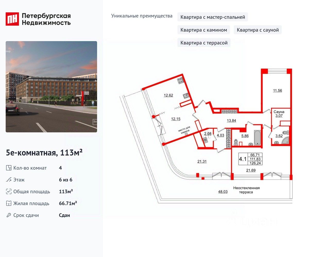 Продается уютная, семейная 4-комнатная квартира от застройщика в жилом комплексе ''Amber Club'' в уютном Василеостровском районе. До метро можно добраться пешком всего за 15 минут. Уникальная особенность этой квартиры возможность установить настоящий дровяной камин, который создаст атмосферу загородного дома. Мастер-спальня с собственной ванной комнатой. Самое приватное пространство в вашей квартире. Сауна в ванной комнате. Расслабьтесь и восстановите силы, как в СПА-салоне. Открытая терраса! Завтракайте или занимайтесь спортом на свежем воздухе! Уникальная, функциональная европланировка, большая кухня-гостиная 12.62 м², просторная прихожая 17.87 м². Общая площадь квартиры - 113 м², жилая 66.71 м², высота потолка 3.06 м. Квартира продается с отделкой ''Норд Лайн серый комфорт''. Что особенного в ЖК ''Amber Club''? • Уникальные квартиры пентхаусы, квартиры с террасами и каминами • Премиальные виды на Малую Неву и Петровский остров • Шаговая доступность до метро (15 мин. Пешком), удобный выезд на ЗСД прямо с набережной • Amber-сквер с relax-зонами в экостиле и прогулочной аллеей • Единые входные группы со вторым светом, reception и лаунж-зонами