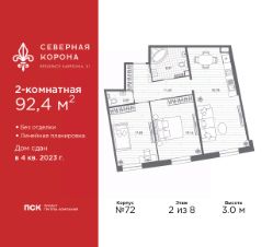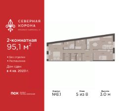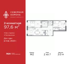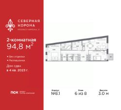 Продается двухкомнатная квартира в ЖК ''Северная корона'' на 2 этаже. Квартира без отделки, после выдачи ключей можно делать ремонт. Общая площадь: 94.3 кв.м., жилая: 35.56 кв.м., площадь просторной кухни-столовой: 20.65 кв.м. Квартира - распашонка, без проходных комнат, окна выходят на paзные стороны дома. В квартире два совмещенных и один раздельный санузел. Высота потолков 3.0 м. Квартира находится в корпусе 1. Дом монолитный, одноподъездный, высотой 3 этажа. На этаже 3 квартиры. В подъезде 1 грузовой лифт. На сегодняшний день строительство окончено, дом сдан в 4 квартале 2023 года. Оформление сделки по договору купли-продажи. В шаговой доступности от дома находятся станции метро (расстояние по прямой): ''Петроградская'' (500 м), ''Чкаловская'' (1.3 км), ''Горьковская'' (1.7 км), ''Чёрная речка'' (1.7 км), также недалеко от этого корпуса расположены станции метро: ''Чернышевская'', ''Спортивная''. Премиальный жилой комплекс ''Северная корона'' расположился в парадной части Петроградской стороны на пересечении ее главного проспекта — Каменноостровского и набережной реки Карповки.Двухсотметровое парадное лобби, дизайнерский ландшафт, собственная фитнес-студия, парадная гостиная для встреч и переговоров, игровой клуб для детей. А также: системы очистки и подготовки воды и воздуха, консьерж-сервис, бесключевой доступ, помещения для ожидания и многое другое.Архитектура премиального дома ''Северная корона'' — это современное воплощение и новое развитие архитектуры северного модерна. Особенность и уникальность дома в его протяженности вдоль реки Карповки. Фасад исключает монотонность, линии интегрированы в канву курдонера и внутренних общественных пространств, обращённых как в сторону Каменноостровского проспекта, так и Иоановского монастыря. Все квартиры в полной мере можно назвать видовыми они открыты историческому окружению и ландшафтной архитектуре. Что дарит владельцам единственные в своем роде захватывающие виды.Этажность: 4 - 9 этажей (в т.ч. 1 подземный)Дом СДАН.Класс проекта: Премиум класс Уникальность проекта:- Французские балконы- Видовые квартиры- Панорамное остекление- Потолки до 3,5 метров- Мансардные окна- Индивидуальные сплит шахты- Считывание номеров автомобилей- Современная архитектура и инженерия- Двор парк- Центральное лобби 200 кв.м. #2UA407