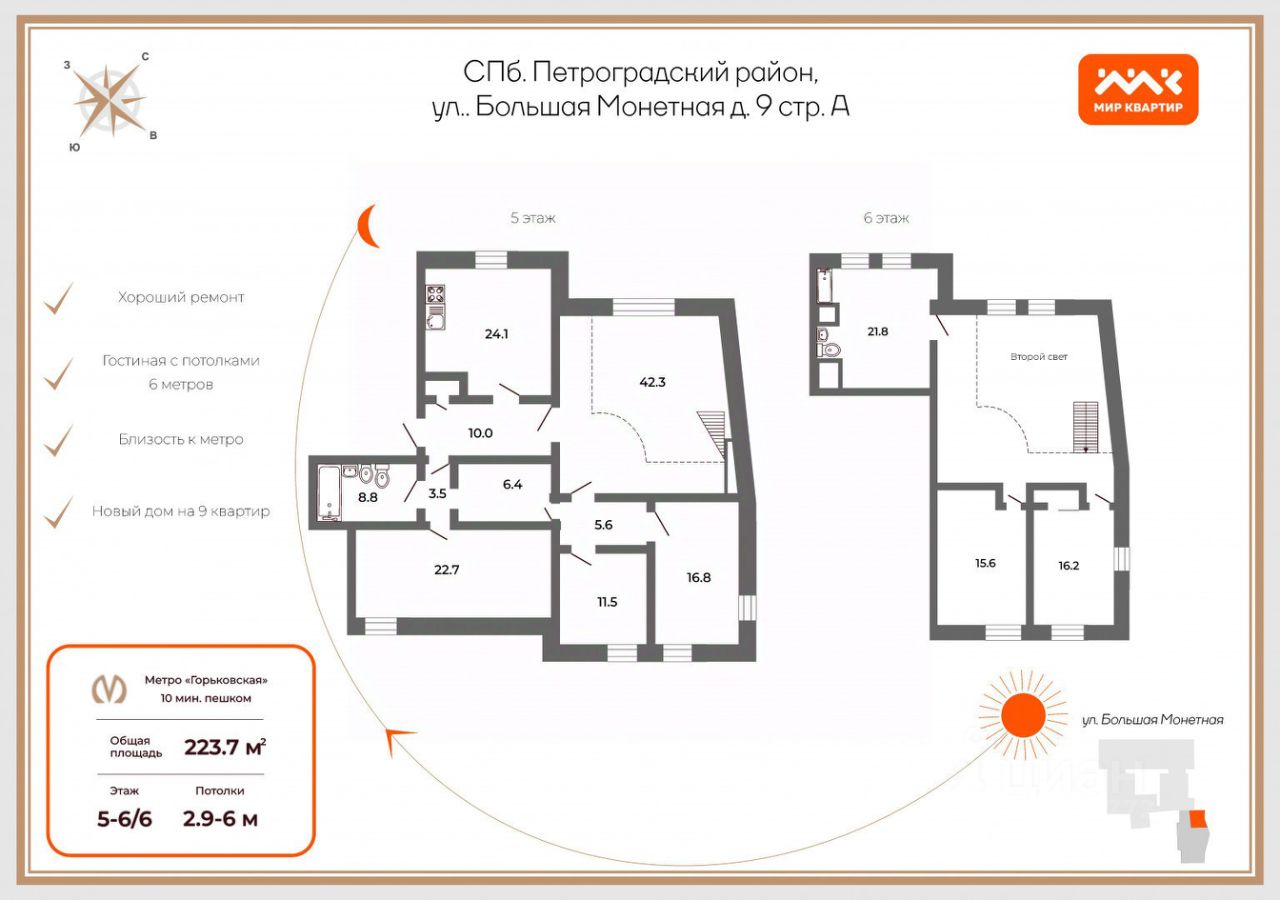 Арт. 96370487 Предлагаем к продаже 6-ти комнатную квартиру общей площадью 192 кв.м. в историческом центре Санкт-Петербурга, в самом сердце Петроградского района. Легким прогулочным шагом за 9 минут вы оказываетесь у Петропавловской крепости, в 10 минутах Александровский парк, а буквально через улицу Петроградская набережная, где монументально застыла Аврора! Дом имеет статус памятника архитектуры. В 2020 году проведен капитальный ремонт всех инженерных систем, коммуникаций, лифтового оборудования, крыши, подвальных помещений и фундамента. Перекрытия железобетонные, материал стен кирпич. Построен по индивидуальному проекту в 1913 году. Перекрытия железобетонные, материал стен кирпич. В квартире расположены 2 камина, в больших комнатах по 2 окна, что позволит разделить их при желании и задумке дизайнера. Главная особенность квартиры - это эркерный балкон из которого открывается вид на набережную и элитный ЖК Аврора со шпилем. В доме 2 лестницы: парадная и черная ( в хорошем состоянии). Высота потолков 3.5 метра! Квартира подойдет, как для истинного ценителя имперских домов с высокими потолками, огромными комнатами, так и для предпринимателей, которые задумают отремонтировать и сдавать посуточно, учитывая, что Санкт-Петербург туристическая мекка, вложения оправдают себя со сторицей! Прямая продажа! Один собственник! Документы готовы! Ждем на просмотр! Предлагаем ПРЕМИАЛЬНОЕ обслуживание для требовательных клиентов. Оперативно организуем просмотр, предоставим полную информацию по объекту. 20 лет работы с требовательными клиентами подготовили нас к решению ВАШИХ сложных задач. Будем рады знакомству! Ул. Рубинштейна, д.8.