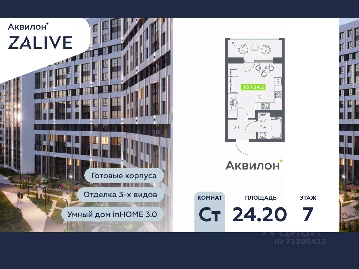 Купи квартиру в ЖК ''Аквилон ZALIVE''! Отделка В квартире выполнена предчистовая отделка WhiteBox +Возможен дозаказ отделки в любом из 3 цветов: SAND, TERRA, GRAPHITE Отделка входит в стоимость квартиры в ДДУ ЖК ''Аквилон ZALIVE'' Жилой комплекс ''Аквилон ZALIVE'' расположился в уникальной части престижного Васильевского острова. С одной стороны рядом деловой и исторический центр, с другой берег Финского залива и новая современная инфраструктура в пешей доступности. Проект включает в себя пять тринадцатиэтажных ''умных'' домов в едином архитектурном стиле. Насыщенная социальная инфраструктура, инновации в каждой квартире, стильное благоустройство территории и видовые характеристики это лишь часть уникальных преимуществ жилого комплекса ''Аквилон ZALIVE''. -Малошумные лифты -Сквозные парадные -Светопрозрачные входные группы -Школа во дворе -Безбарьерная среда -Паркинг Стандарты Группы Аквилон для вашей комфортной жизни Thermo-S экономия на коммунальных платежах за счет дополнительно утепленных стен, кровли и цоколя. Энергоэффективные окна с селективным покрытием и аргоновым заполнением Soundstop - дополнительная шумоизоляция внутренних перегородок и межэтажных перекрытий, шумозащитные окна, малошумные лифты Light-in - в квартирах устанавливаются широкоформатные окна, увеличены на 30%. Высота подоконников на уровне 60 см от пола. Vent-in - в каждой комнате есть клапаны индивидуальной вентиляции, которые обеспечивают приток свежего воздуха с улицы. inHOME умный дом в каждой квартире Интеллектуальная цифровая система, которая позволит дистанционно решать бытовые вопросы, управлять квартирой и экономить на оплате коммунальных услуг. В состав inHOME входят: IP-домофон, Face key, ''умные'' счетчики, датчики протечки, дистанционное отключение розеток, и т.д. Двор ваш личный парк Для разработки проекта благоустройства и озеленения Группа Аквилон привлекла студию DEREVO PARK, которую ассоциация ландшафтных архитекторов России четыре года подряд признавала лучшей. Два хвойных сада, расположенные вдоль западной стороны квартала, станут визитной карточкой ЖК ''Аквилон ZALIVE''. Локация и инфраструктура Васильевский остров это море и прогулки, Санкт-Петербургский Государственный Университет и Ростральные колонны, музей современного искусства ''Эрарта'' и концептуальное пространство ''Севкабель Порт''. Достаточно переехать через мост и вот вы уже в центре или на Петроградской стороне. - 7 мин. до развязки ЗСД -12 мин. до м. Приморская -15 мин. до м. Невский проспект #zsac7A