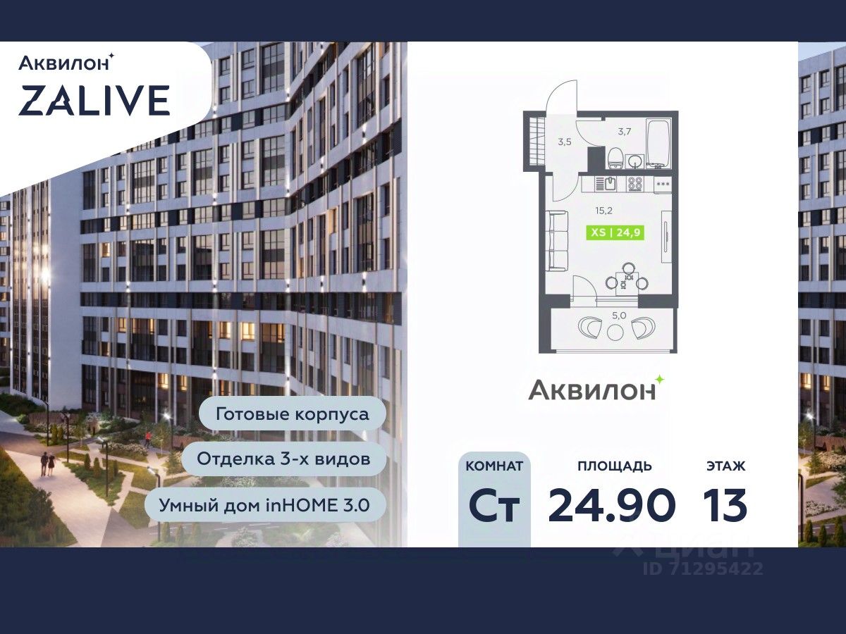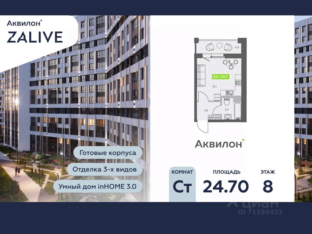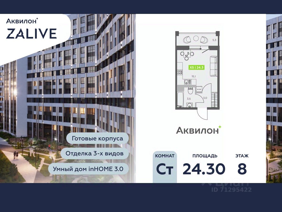 Купи квартиру в ЖК ''Аквилон ZALIVE''! Отделка В квартире выполнена предчистовая отделка WhiteBox +Возможен дозаказ отделки в любом из 3 цветов: SAND, TERRA, GRAPHITE Отделка входит в стоимость квартиры в ДДУ ЖК ''Аквилон ZALIVE'' Жилой комплекс ''Аквилон ZALIVE'' расположился в уникальной части престижного Васильевского острова. С одной стороны рядом деловой и исторический центр, с другой берег Финского залива и новая современная инфраструктура в пешей доступности. Проект включает в себя пять тринадцатиэтажных ''умных'' домов в едином архитектурном стиле. Насыщенная социальная инфраструктура, инновации в каждой квартире, стильное благоустройство территории и видовые характеристики это лишь часть уникальных преимуществ жилого комплекса ''Аквилон ZALIVE''. -Малошумные лифты -Сквозные парадные -Светопрозрачные входные группы -Школа во дворе -Безбарьерная среда -Паркинг Стандарты Группы Аквилон для вашей комфортной жизни Thermo-S экономия на коммунальных платежах за счет дополнительно утепленных стен, кровли и цоколя. Энергоэффективные окна с селективным покрытием и аргоновым заполнением Soundstop - дополнительная шумоизоляция внутренних перегородок и межэтажных перекрытий, шумозащитные окна, малошумные лифты Light-in - в квартирах устанавливаются широкоформатные окна, увеличены на 30%. Высота подоконников на уровне 60 см от пола. Vent-in - в каждой комнате есть клапаны индивидуальной вентиляции, которые обеспечивают приток свежего воздуха с улицы. inHOME умный дом в каждой квартире Интеллектуальная цифровая система, которая позволит дистанционно решать бытовые вопросы, управлять квартирой и экономить на оплате коммунальных услуг. В состав inHOME входят: IP-домофон, Face key, ''умные'' счетчики, датчики протечки, дистанционное отключение розеток, и т.д. Двор ваш личный парк Для разработки проекта благоустройства и озеленения Группа Аквилон привлекла студию DEREVO PARK, которую ассоциация ландшафтных архитекторов России четыре года подряд признавала лучшей. Два хвойных сада, расположенные вдоль западной стороны квартала, станут визитной карточкой ЖК ''Аквилон ZALIVE''. Локация и инфраструктура Васильевский остров это море и прогулки, Санкт-Петербургский Государственный Университет и Ростральные колонны, музей современного искусства ''Эрарта'' и концептуальное пространство ''Севкабель Порт''. Достаточно переехать через мост и вот вы уже в центре или на Петроградской стороне. - 7 мин. до развязки ЗСД -12 мин. до м. Приморская -15 мин. до м. Невский проспект #25Fa9d
