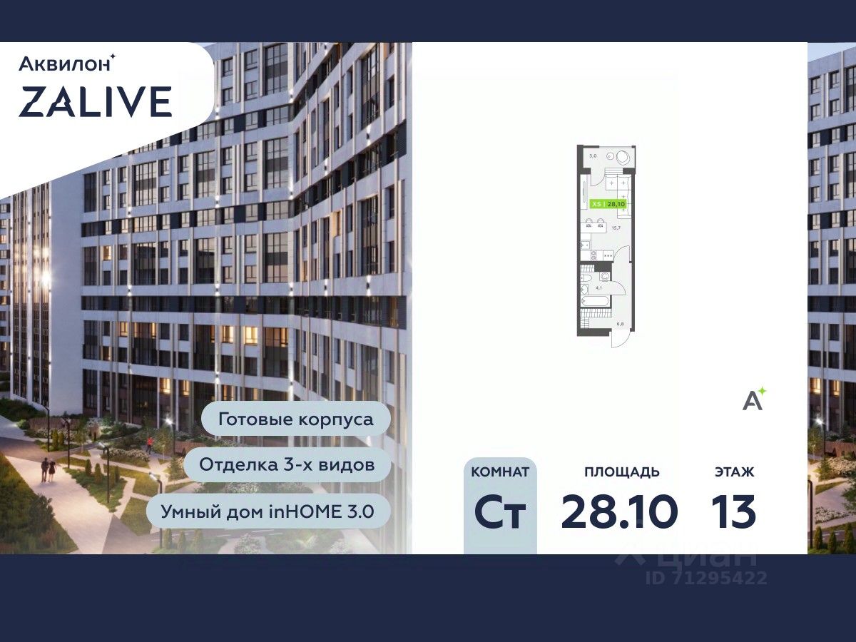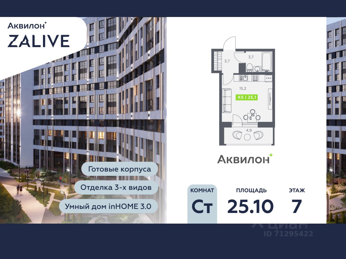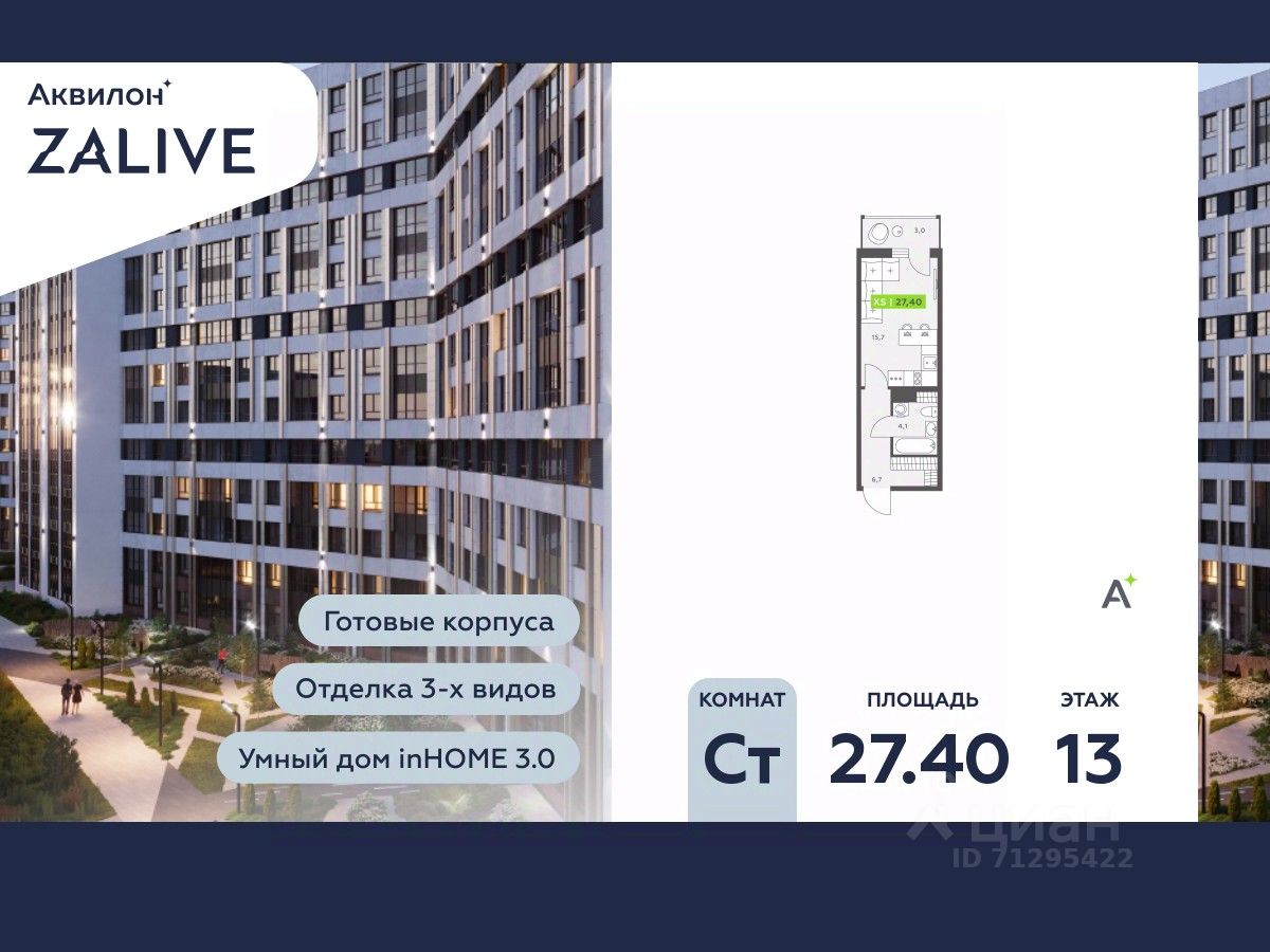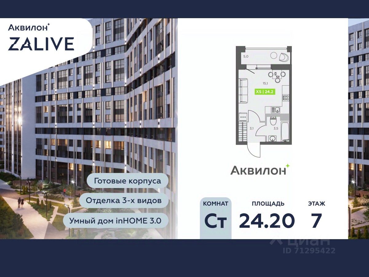 Купи квартиру в ЖК ''Аквилон ZALIVE''! Отделка В квартире выполнена предчистовая отделка WhiteBox +Возможен дозаказ отделки в любом из 3 цветов: SAND, TERRA, GRAPHITE Отделка входит в стоимость квартиры в ДДУ ЖК ''Аквилон ZALIVE'' Жилой комплекс ''Аквилон ZALIVE'' расположился в уникальной части престижного Васильевского острова. С одной стороны рядом деловой и исторический центр, с другой берег Финского залива и новая современная инфраструктура в пешей доступности. Проект включает в себя пять тринадцатиэтажных ''умных'' домов в едином архитектурном стиле. Насыщенная социальная инфраструктура, инновации в каждой квартире, стильное благоустройство территории и видовые характеристики это лишь часть уникальных преимуществ жилого комплекса ''Аквилон ZALIVE''. -Малошумные лифты -Сквозные парадные -Светопрозрачные входные группы -Школа во дворе -Безбарьерная среда -Паркинг Стандарты Группы Аквилон для вашей комфортной жизни Thermo-S экономия на коммунальных платежах за счет дополнительно утепленных стен, кровли и цоколя. Энергоэффективные окна с селективным покрытием и аргоновым заполнением Soundstop - дополнительная шумоизоляция внутренних перегородок и межэтажных перекрытий, шумозащитные окна, малошумные лифты Light-in - в квартирах устанавливаются широкоформатные окна, увеличены на 30%. Высота подоконников на уровне 60 см от пола. Vent-in - в каждой комнате есть клапаны индивидуальной вентиляции, которые обеспечивают приток свежего воздуха с улицы. inHOME умный дом в каждой квартире Интеллектуальная цифровая система, которая позволит дистанционно решать бытовые вопросы, управлять квартирой и экономить на оплате коммунальных услуг. В состав inHOME входят: IP-домофон, Face key, ''умные'' счетчики, датчики протечки, дистанционное отключение розеток, и т.д. Двор ваш личный парк Для разработки проекта благоустройства и озеленения Группа Аквилон привлекла студию DEREVO PARK, которую ассоциация ландшафтных архитекторов России четыре года подряд признавала лучшей. Два хвойных сада, расположенные вдоль западной стороны квартала, станут визитной карточкой ЖК ''Аквилон ZALIVE''. Локация и инфраструктура Васильевский остров это море и прогулки, Санкт-Петербургский Государственный Университет и Ростральные колонны, музей современного искусства ''Эрарта'' и концептуальное пространство ''Севкабель Порт''. Достаточно переехать через мост и вот вы уже в центре или на Петроградской стороне. - 7 мин. до развязки ЗСД -12 мин. до м. Приморская -15 мин. до м. Невский проспект #25Fa9d