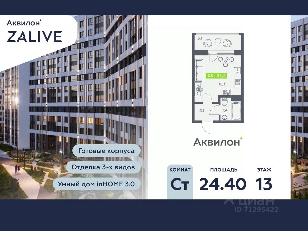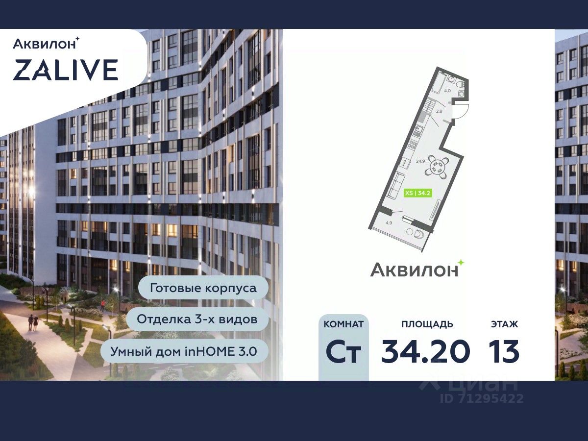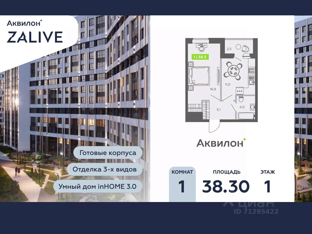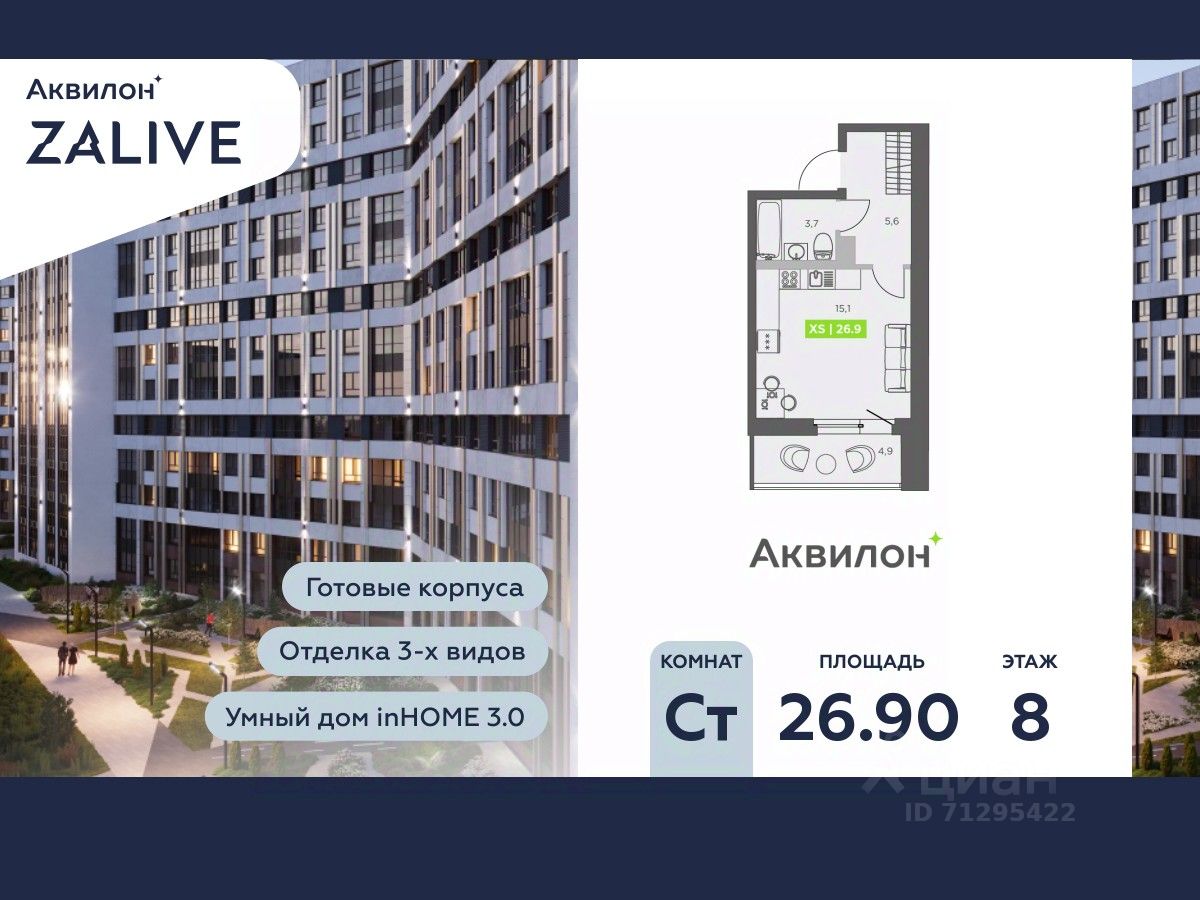 Купи квартиру в ЖК ''Аквилон ZALIVE''! Отделка В квартире выполнена предчистовая отделка WhiteBox +Возможен дозаказ отделки в любом из 3 цветов: SAND, TERRA, GRAPHITE Отделка входит в стоимость квартиры в ДДУ ЖК ''Аквилон ZALIVE'' Жилой комплекс ''Аквилон ZALIVE'' расположился в уникальной части престижного Васильевского острова. С одной стороны рядом деловой и исторический центр, с другой берег Финского залива и новая современная инфраструктура в пешей доступности. Проект включает в себя пять тринадцатиэтажных ''умных'' домов в едином архитектурном стиле. Насыщенная социальная инфраструктура, инновации в каждой квартире, стильное благоустройство территории и видовые характеристики это лишь часть уникальных преимуществ жилого комплекса ''Аквилон ZALIVE''. -Малошумные лифты -Сквозные парадные -Светопрозрачные входные группы -Школа во дворе -Безбарьерная среда -Паркинг Стандарты Группы Аквилон для вашей комфортной жизни Thermo-S экономия на коммунальных платежах за счет дополнительно утепленных стен, кровли и цоколя. Энергоэффективные окна с селективным покрытием и аргоновым заполнением Soundstop - дополнительная шумоизоляция внутренних перегородок и межэтажных перекрытий, шумозащитные окна, малошумные лифты Light-in - в квартирах устанавливаются широкоформатные окна, увеличены на 30%. Высота подоконников на уровне 60 см от пола. Vent-in - в каждой комнате есть клапаны индивидуальной вентиляции, которые обеспечивают приток свежего воздуха с улицы. inHOME умный дом в каждой квартире Интеллектуальная цифровая система, которая позволит дистанционно решать бытовые вопросы, управлять квартирой и экономить на оплате коммунальных услуг. В состав inHOME входят: IP-домофон, Face key, ''умные'' счетчики, датчики протечки, дистанционное отключение розеток, и т.д. Двор ваш личный парк Для разработки проекта благоустройства и озеленения Группа Аквилон привлекла студию DEREVO PARK, которую ассоциация ландшафтных архитекторов России четыре года подряд признавала лучшей. Два хвойных сада, расположенные вдоль западной стороны квартала, станут визитной карточкой ЖК ''Аквилон ZALIVE''. Локация и инфраструктура Васильевский остров это море и прогулки, Санкт-Петербургский Государственный Университет и Ростральные колонны, музей современного искусства ''Эрарта'' и концептуальное пространство ''Севкабель Порт''. Достаточно переехать через мост и вот вы уже в центре или на Петроградской стороне. - 7 мин. до развязки ЗСД -12 мин. до м. Приморская -15 мин. до м. Невский проспект #Z5Cffe